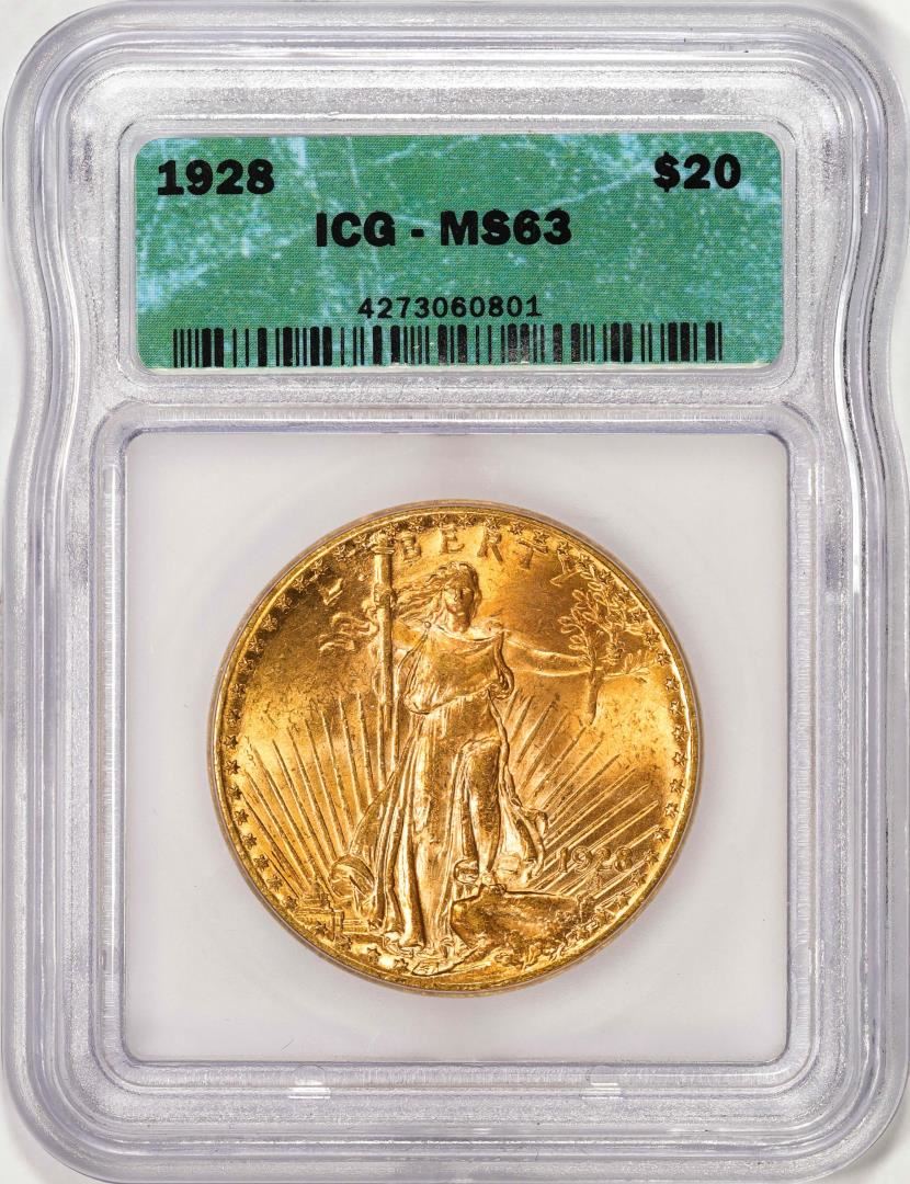 One 1928 $20 St. Gaudens Double Eagle Gold Coin ICG MS63. ICG Certified.