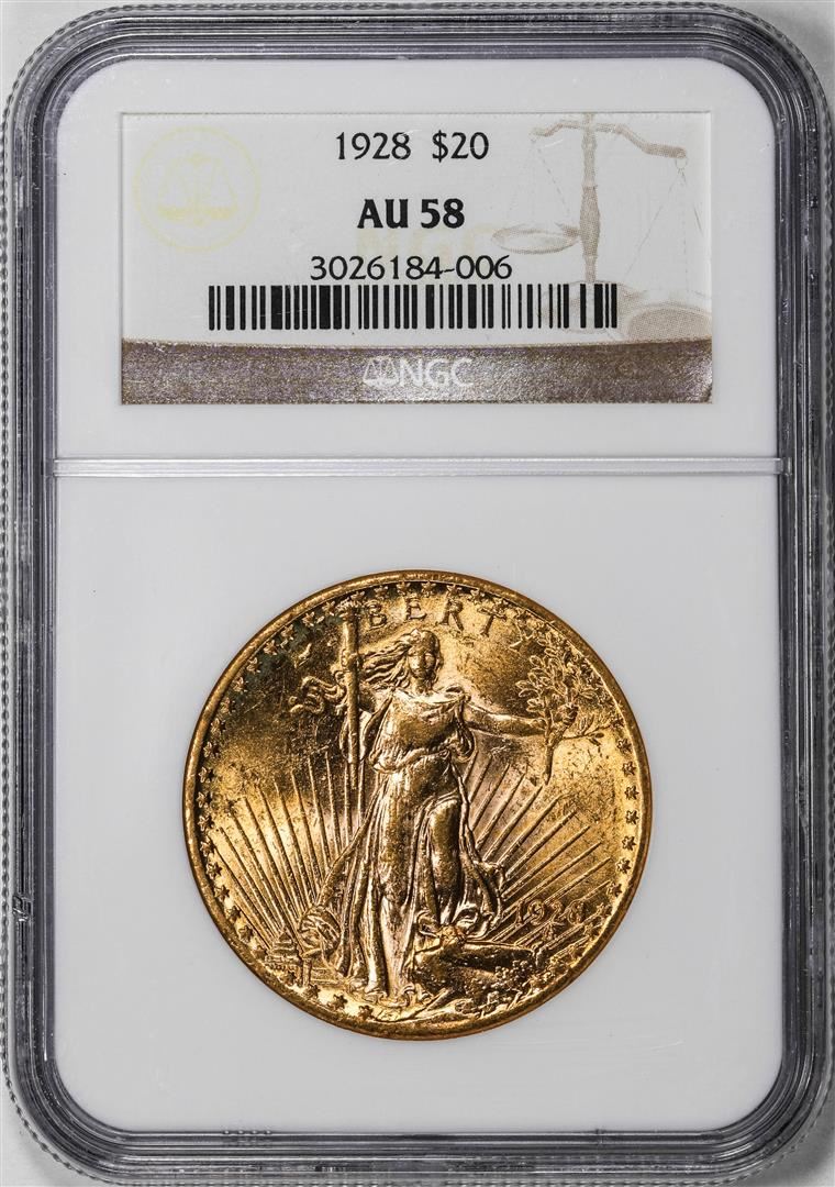 One 1928 $20 St. Gaudens Double Eagle Gold Coin NGC AU58. NGC Certified.