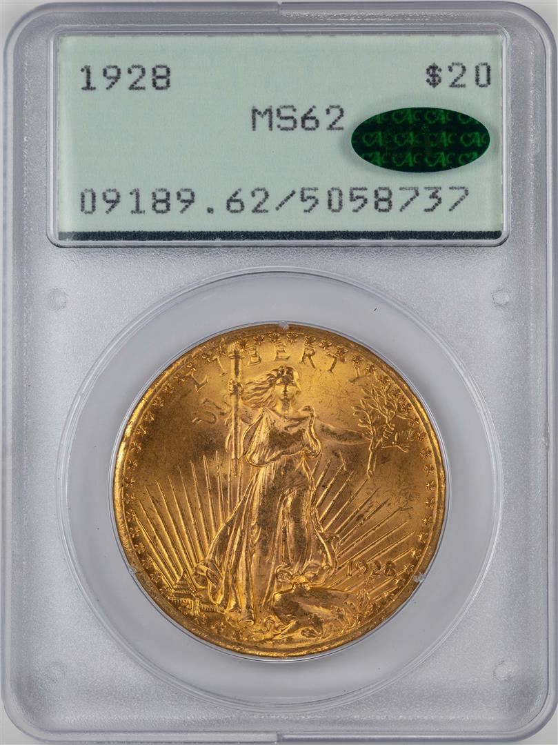 One 1928 $20 St. Gaudens Double Eagle Gold Coin PCGS MS62 CAC. PCGS Graded.