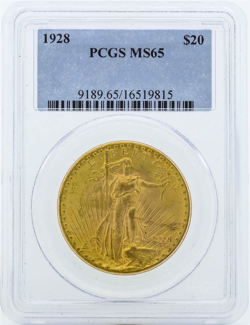 One 1928 $20 St. Gaudens Double Eagle Gold Coin PCGS MS65. PCGS Graded.