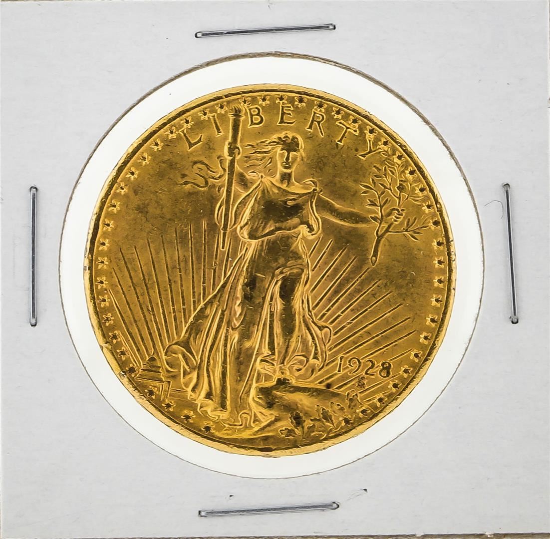 One 1928 $20 St. Gaudens Double Eagle Gold Coin.
