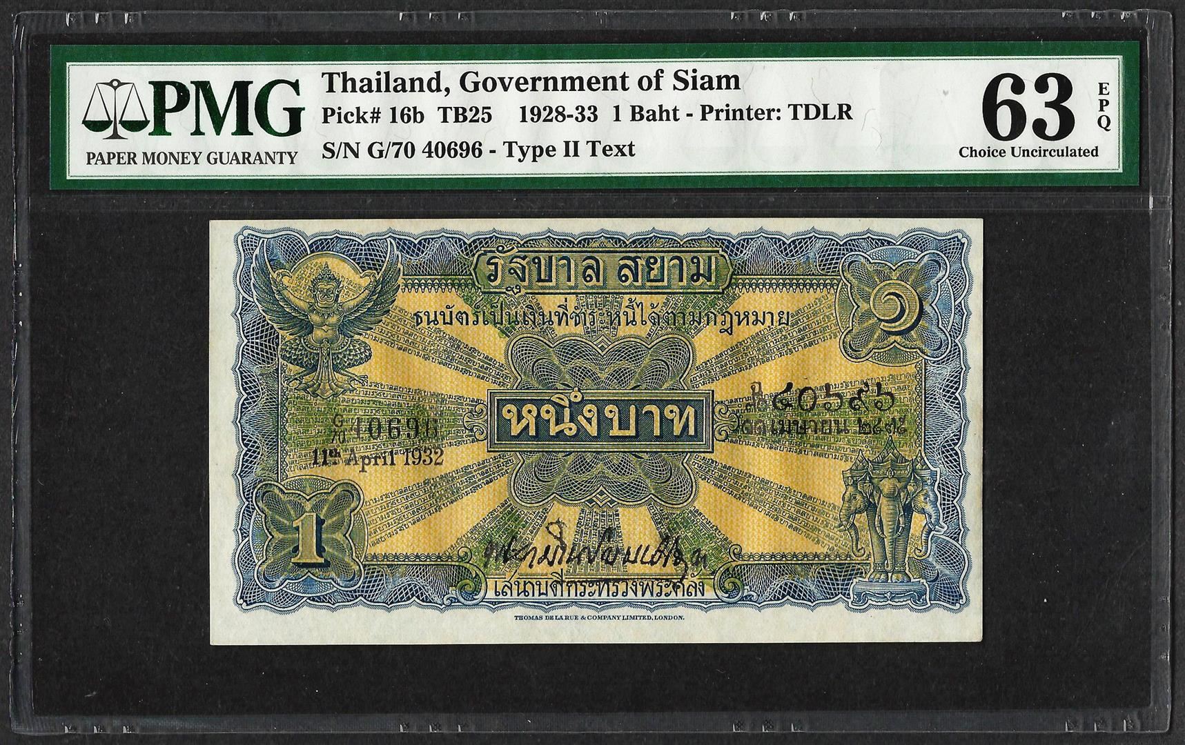 One 1928-33 Government of Siam Thailand Bank Note PMG Choice Uncirculated 63EPQ. PMG Certified.