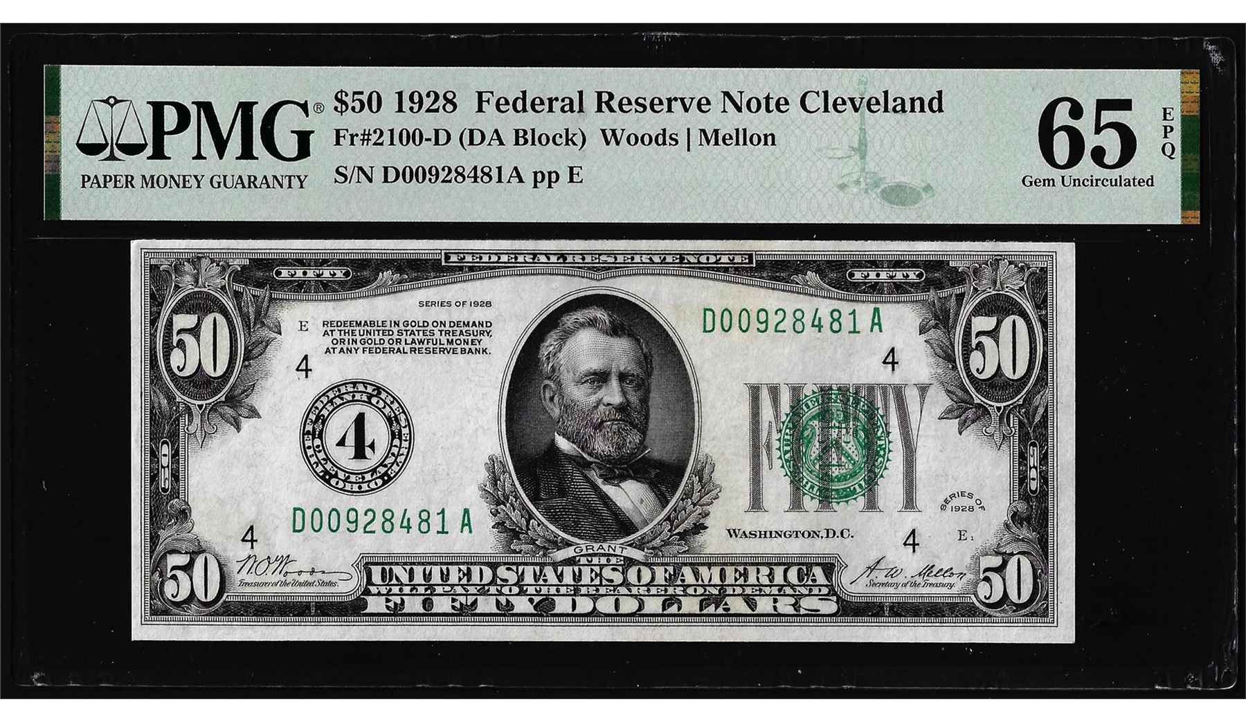 One 1928 $50 Federal Reserve Note Cleveland Fr.2100-D PMG Gem Uncirculated 65EPQ. PMG Certified.