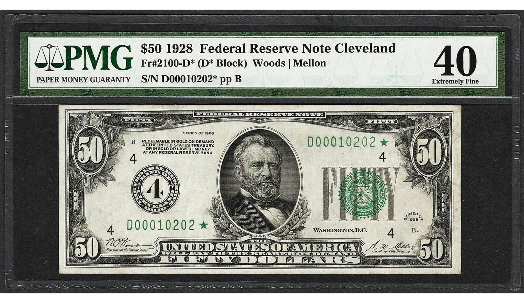 1928 $50 Federal Reserve STAR Note Cleveland Fr.2100-D* PMG Extremely Fine 40