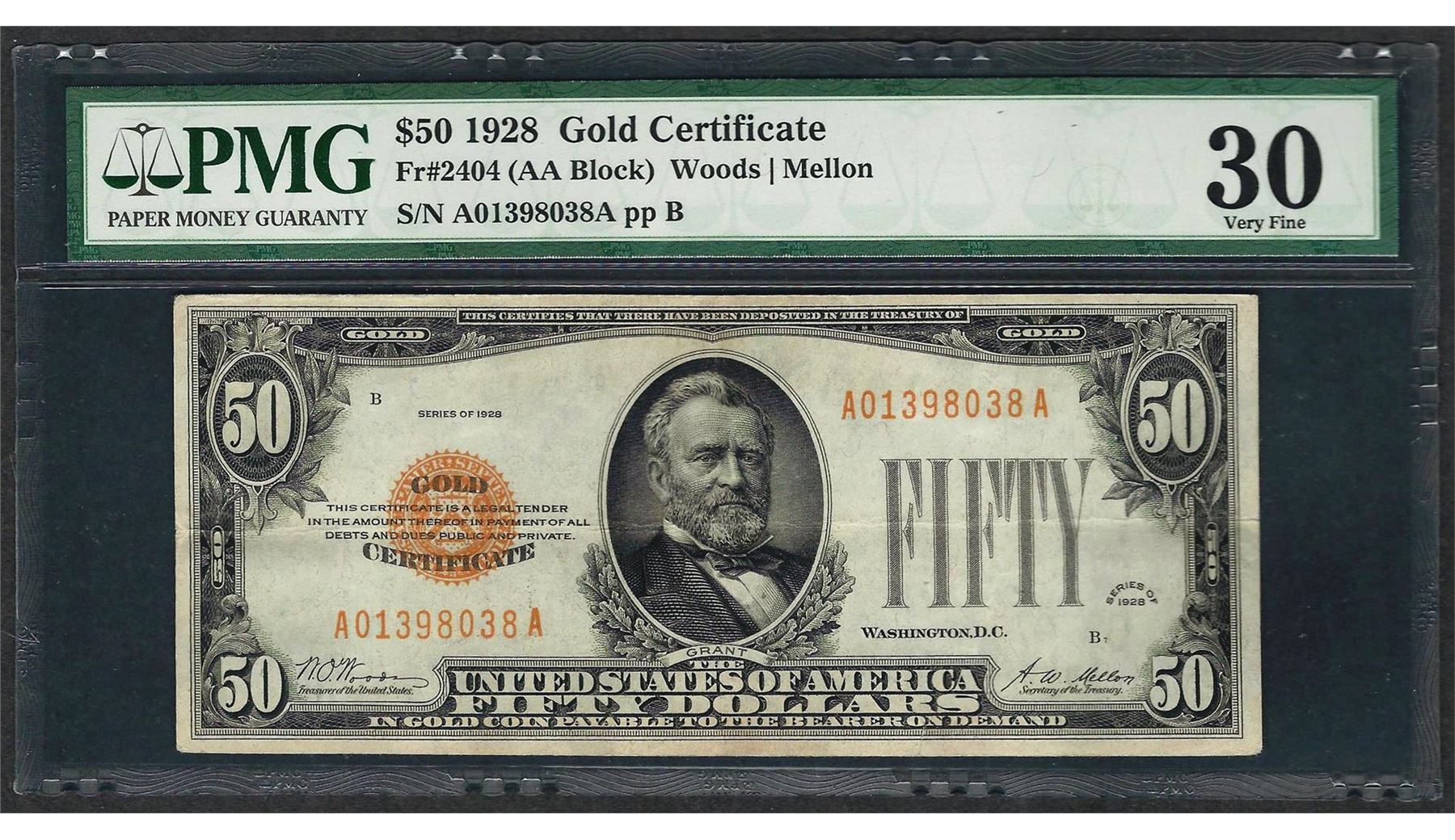 One 1928 $50 Gold Certificate Note Fr.2404 PMG Very Fine 30. PMG Certified.