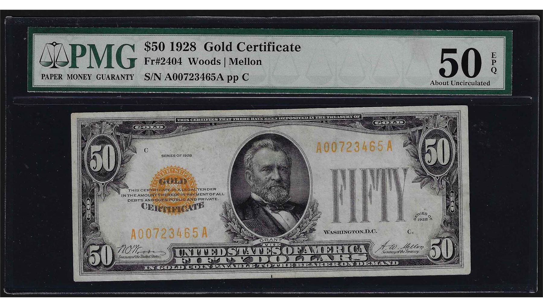 One 1928 $50 Gold Certificate Note PMG About Uncirculated 50EPQ. PMG Certified.