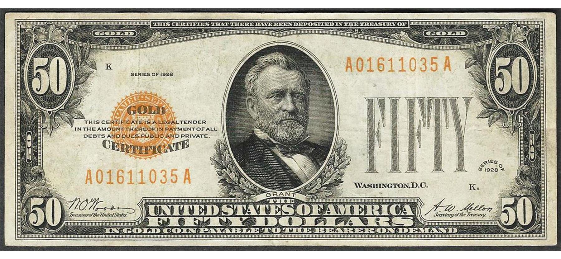 One 1928 $50 Gold Certificate Note.
