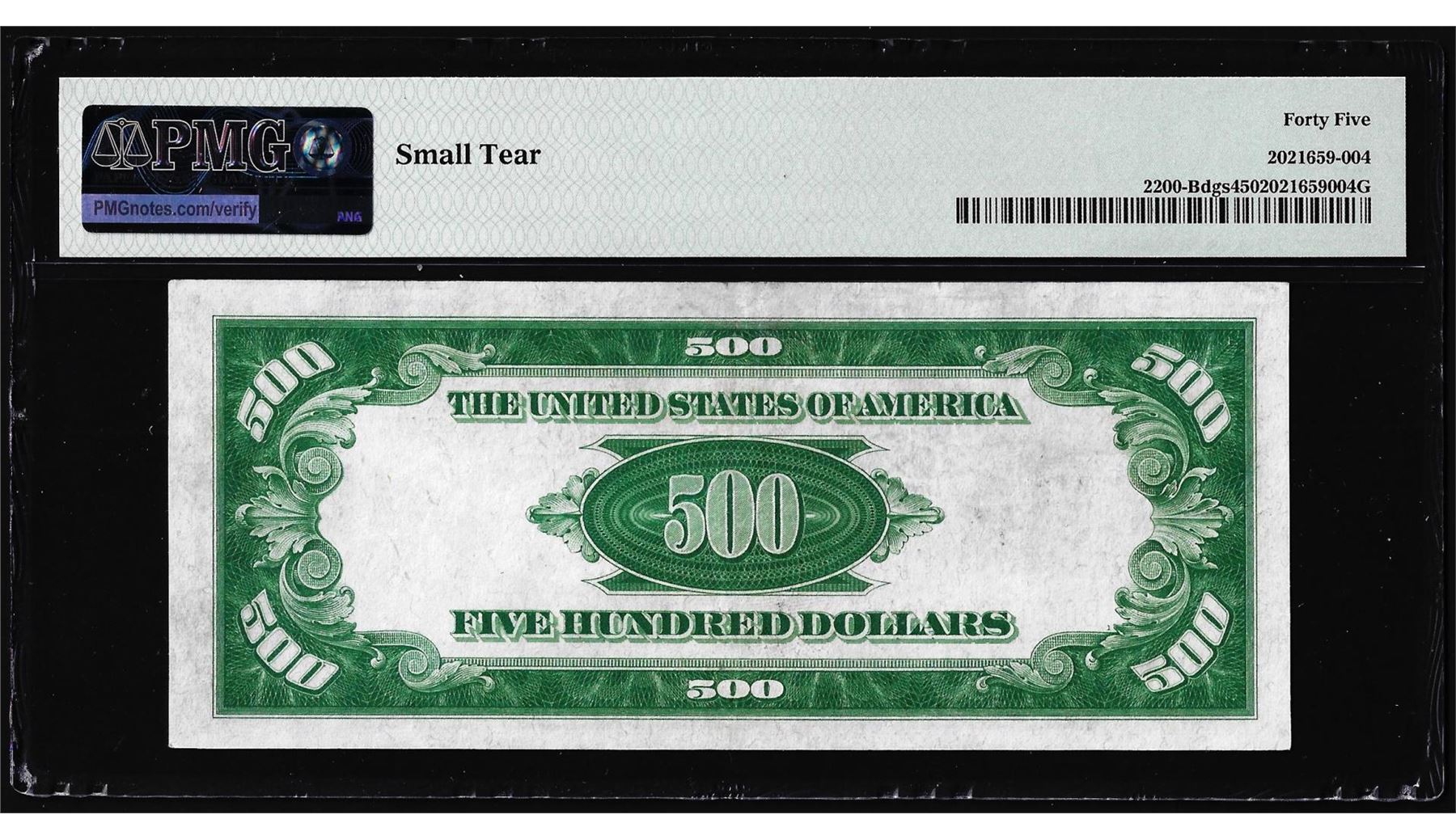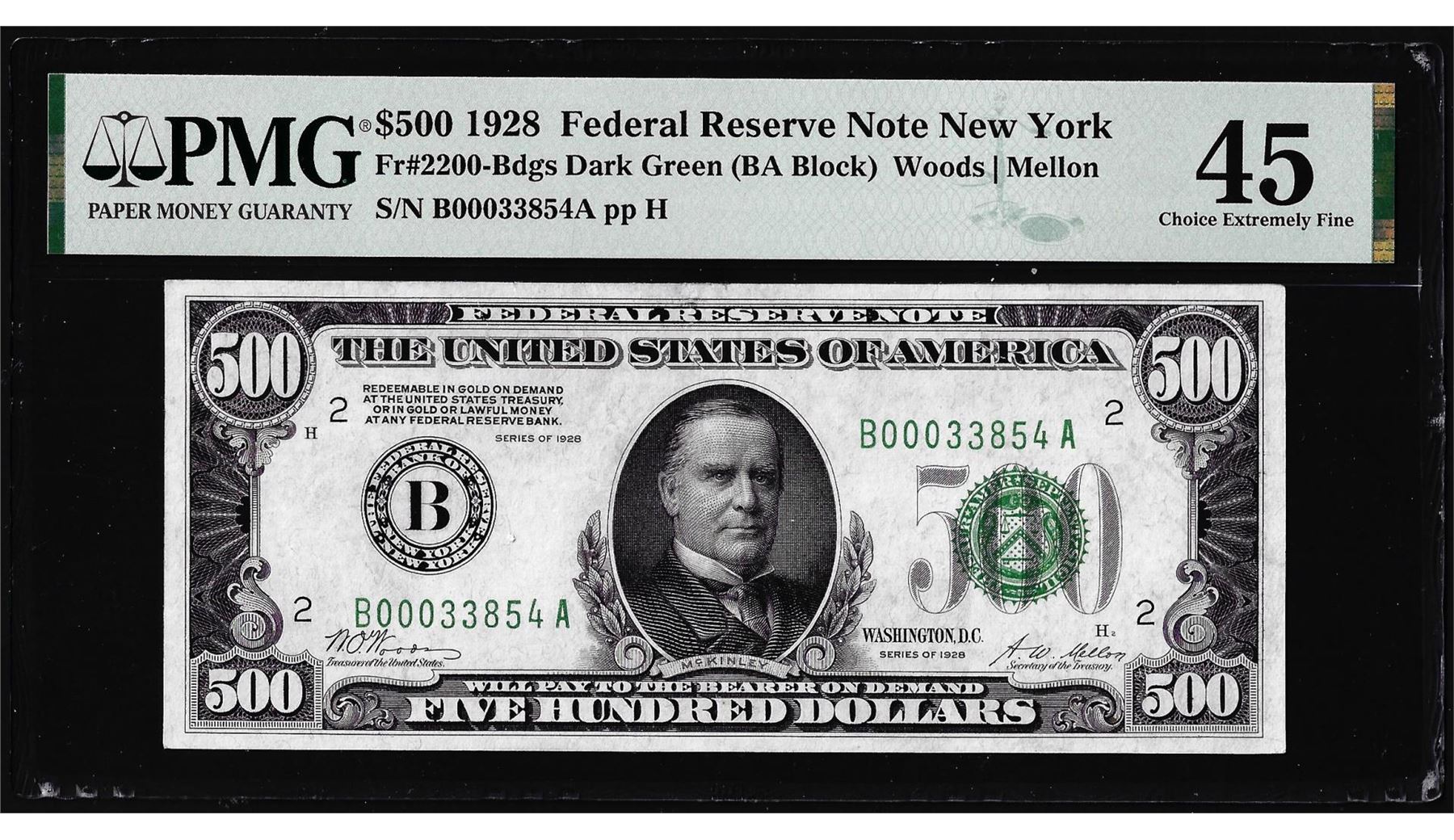 One 1928 $500 Federal Reserve Note New York Fr.2200-B PMG Choice Extremely Fine 45. PMG Certified.