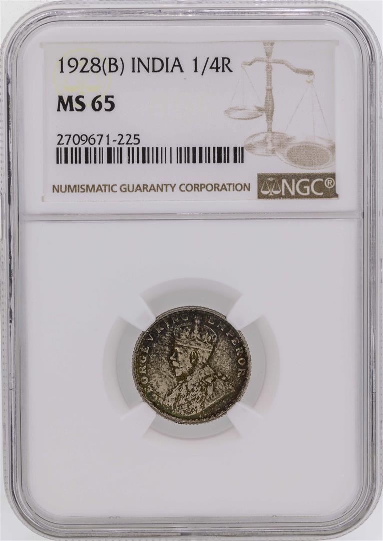 One 1928(B) India 1/4 Rupee Coin NGC MS65. NGC Certified.