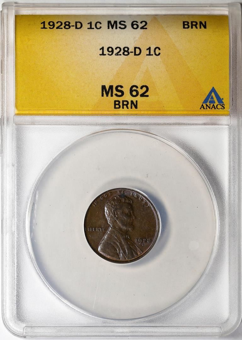 One 1928-D Lincoln Wheat Cent Coin ANACS MS62BRN. ANACS Certified.