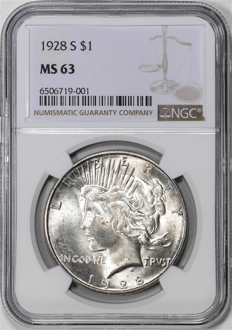 One 1928-S $1 Peace Silver Dollar Coin NGC MS63. NGC Certified.
