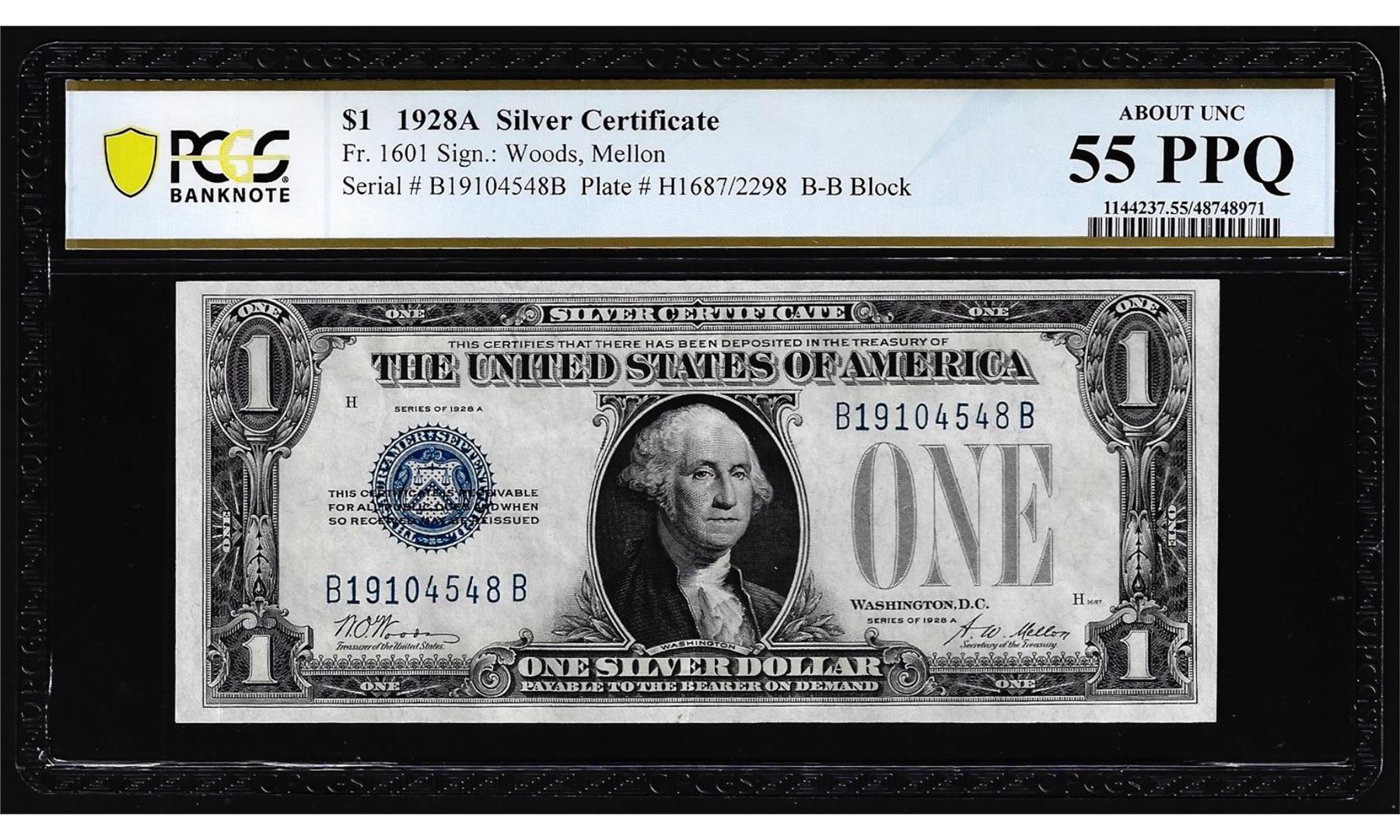 One 1928A $1 Funnyback Silver Certificate Not Fr.1601 PCGS About Uncirculated 55PPQ. PCGS Graded.