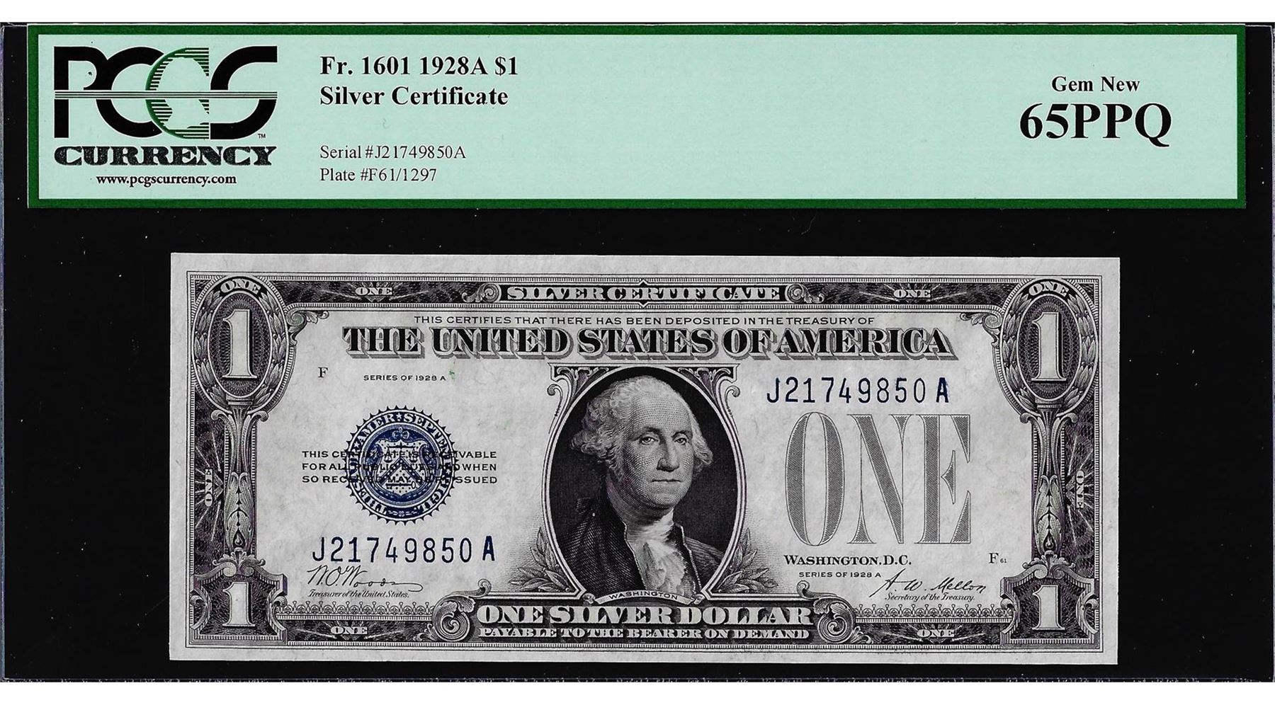 One 1928A $1 Funnyback Silver Certificate Note Fr.1601 PCGS Gem New 65PPQ. PCGS Graded.