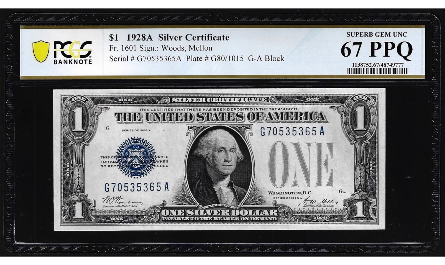 One 1928A $1 Funnyback Silver Certificate Note Fr.1601 PCGS Superb Gem Unc 67PPQ. PCGS Graded.