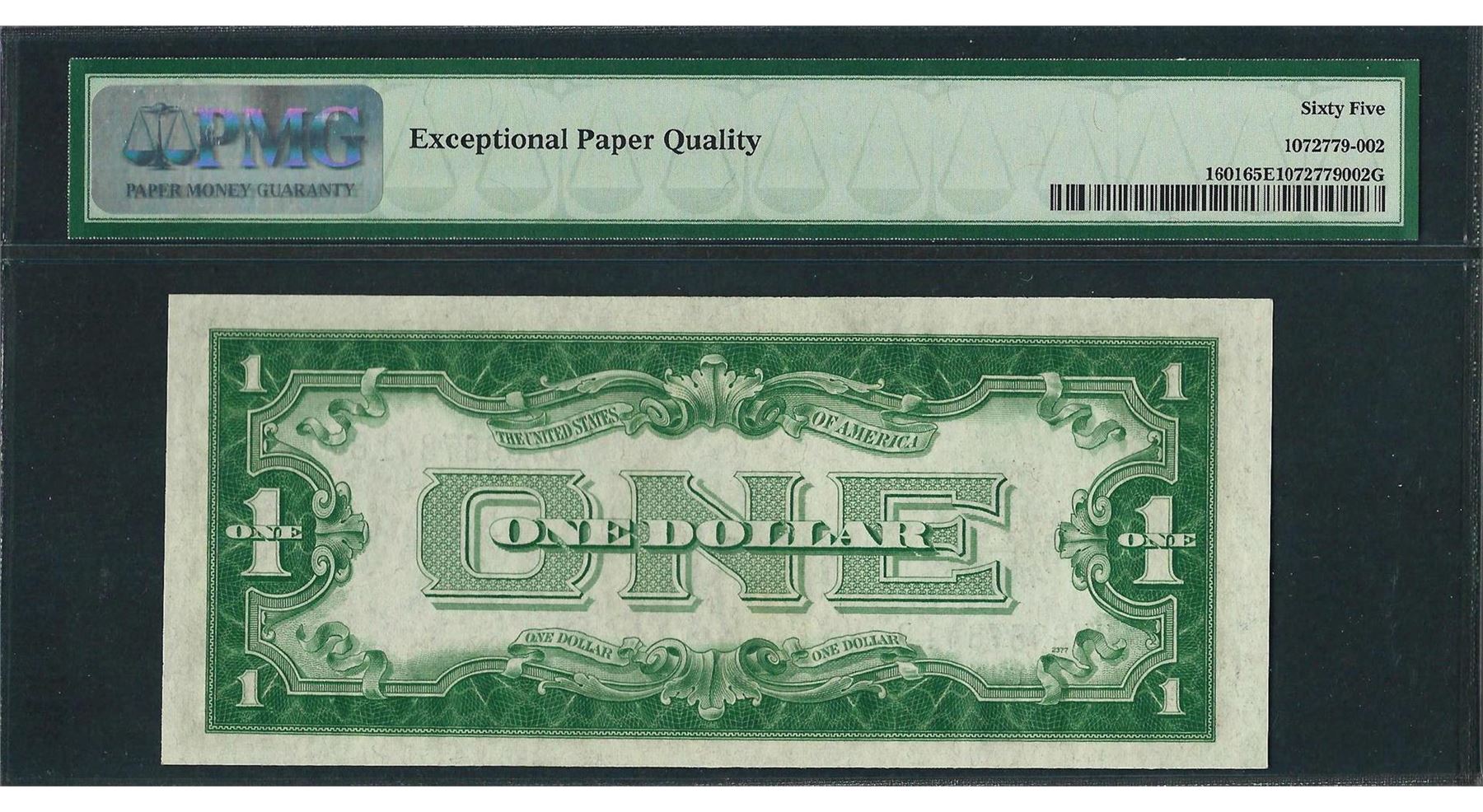 One 1928A $1 Funnyback Silver Certificate Note Fr.1601 PMG Gem Uncirculated 65EPQ. PMG Certified.