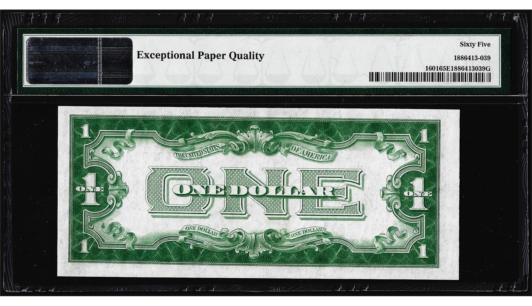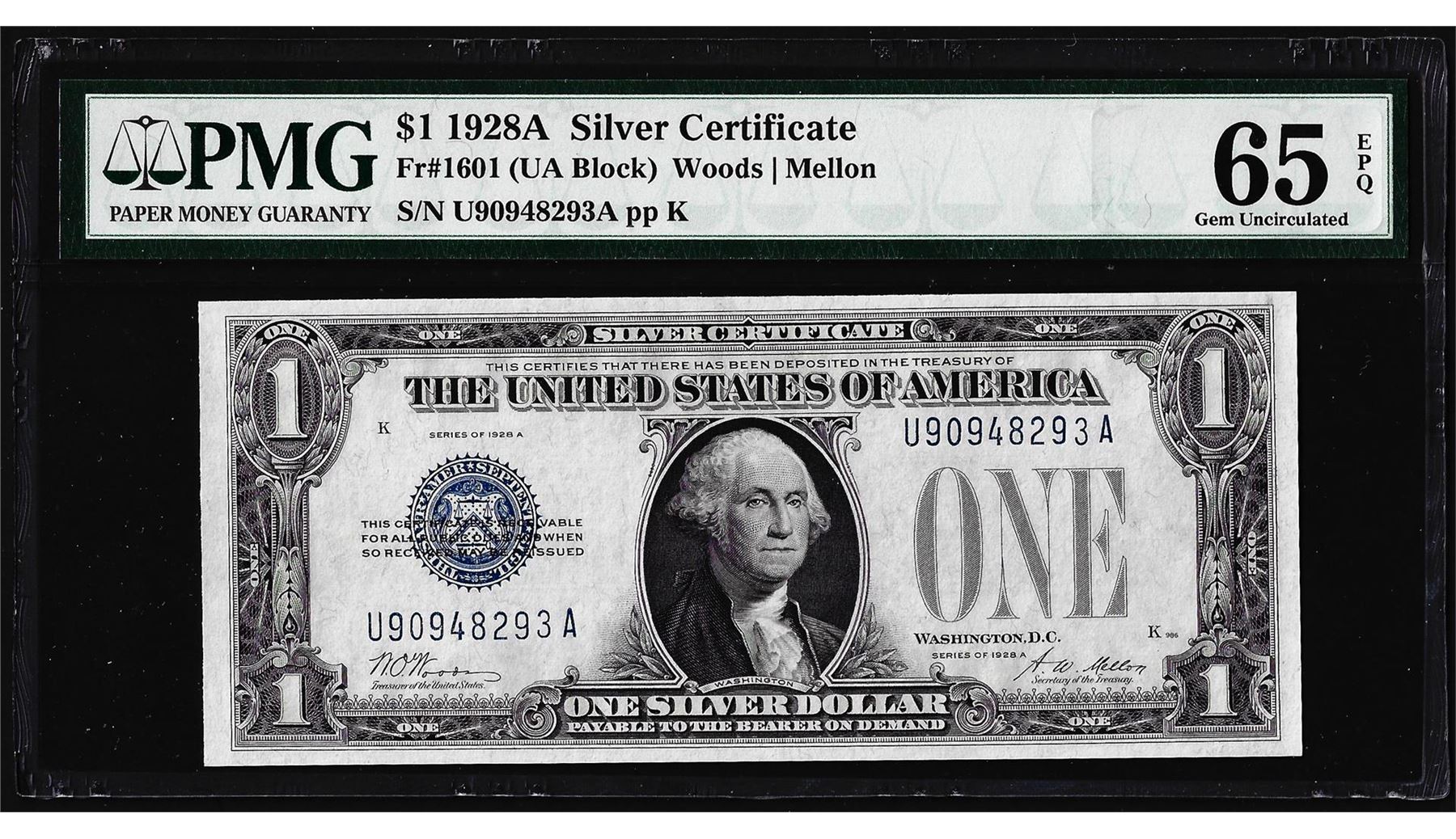 One 1928A $1 Funnyback Silver Certificate Note Fr.1601 PMG Gem Uncirculated 65EPQ. PMG Certified.