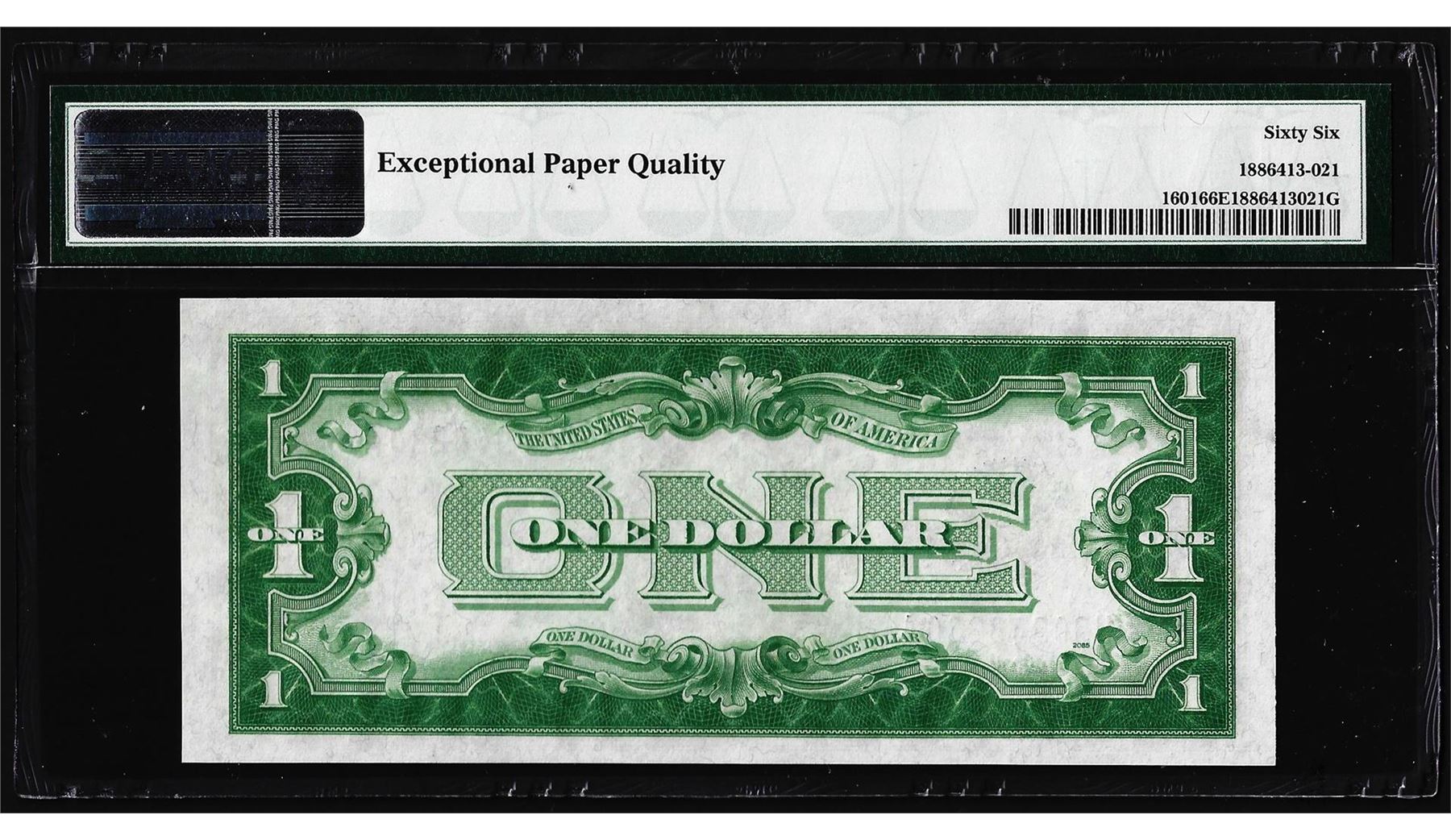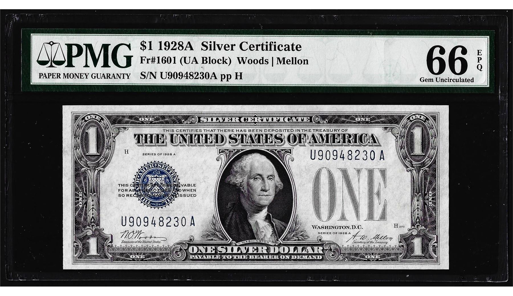 One 1928A $1 Funnyback Silver Certificate Note Fr.1601 PMG Gem Uncirculated 66EPQ. PMG Certified.