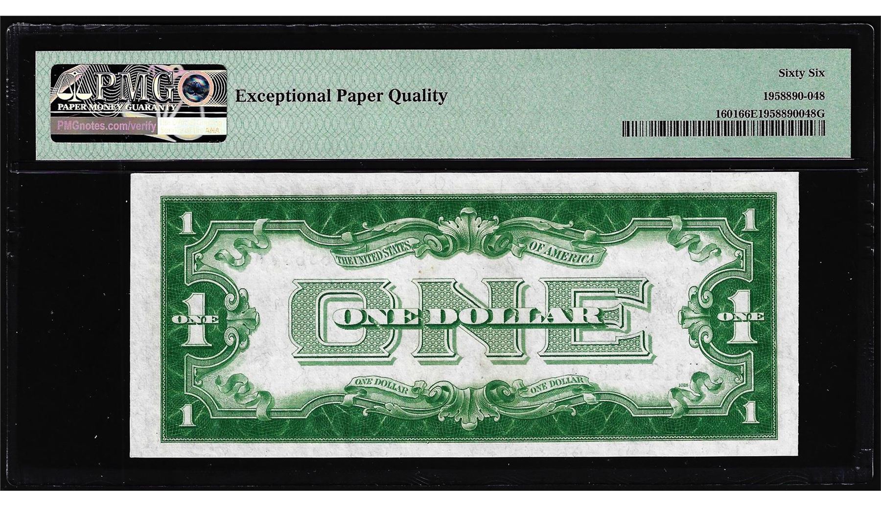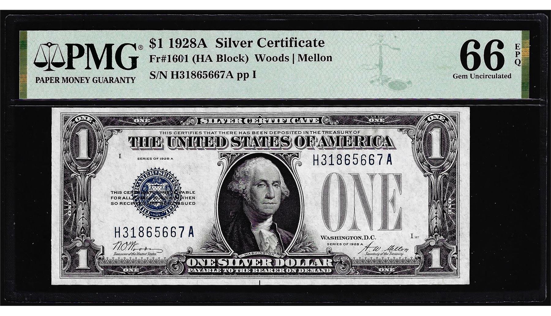 One 1928A $1 Funnyback Silver Certificate Note Fr.1601 PMG Gem Uncirculated 66EPQ. PMG Certified.