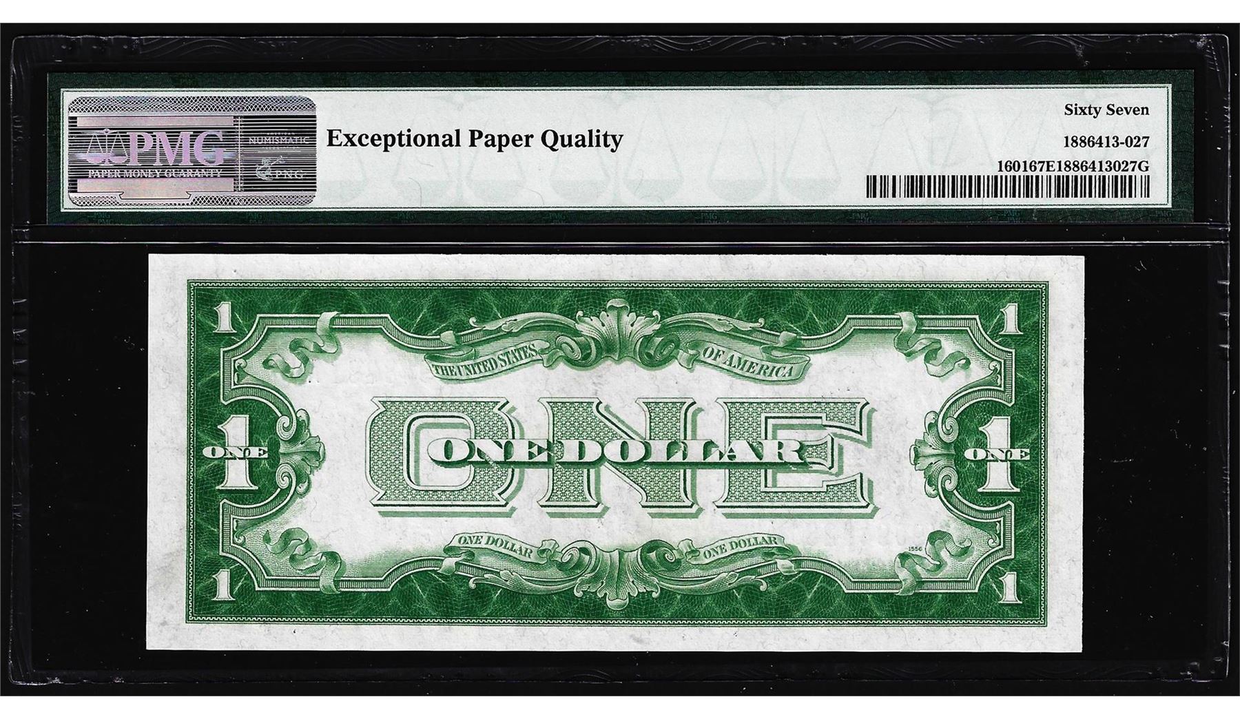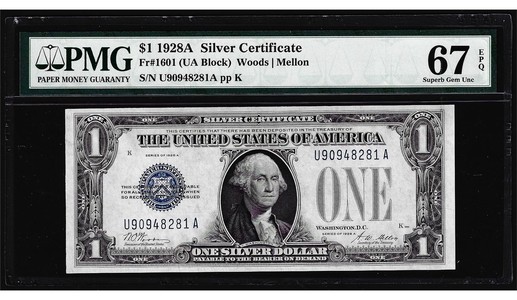 One 1928A $1 Funnyback Silver Certificate Note Fr.1601 PMG Superb Gem Uncirculated 67EPQ. PMG Certified.