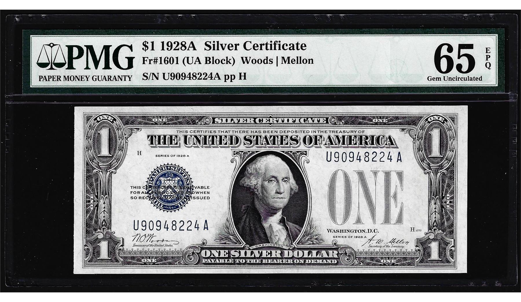 One 1928A $1 Silver Certificate Note Fr.1601 PMG Gem Uncirculated 65EPQ. PMG Certified.