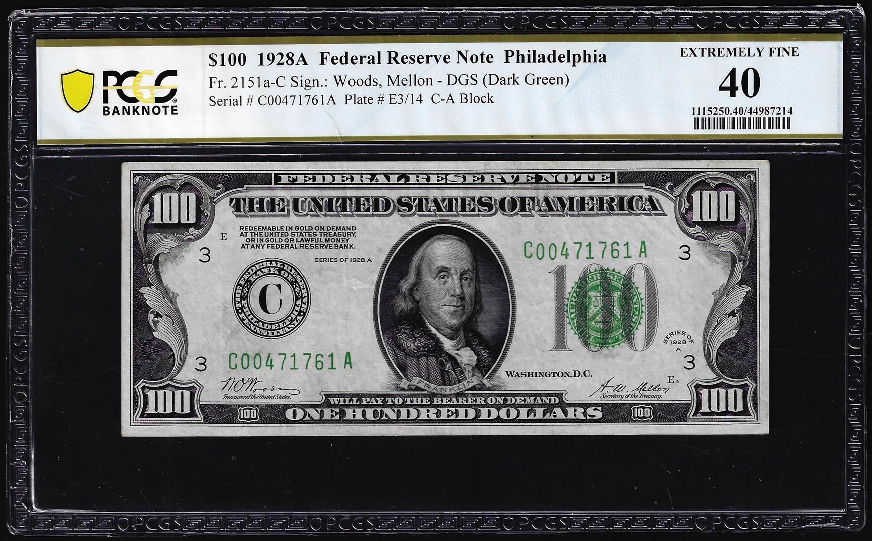 1928A $100 Federal Reserve Note Philadelphia Fr.2150a-C PCGS Extremely Fine 40