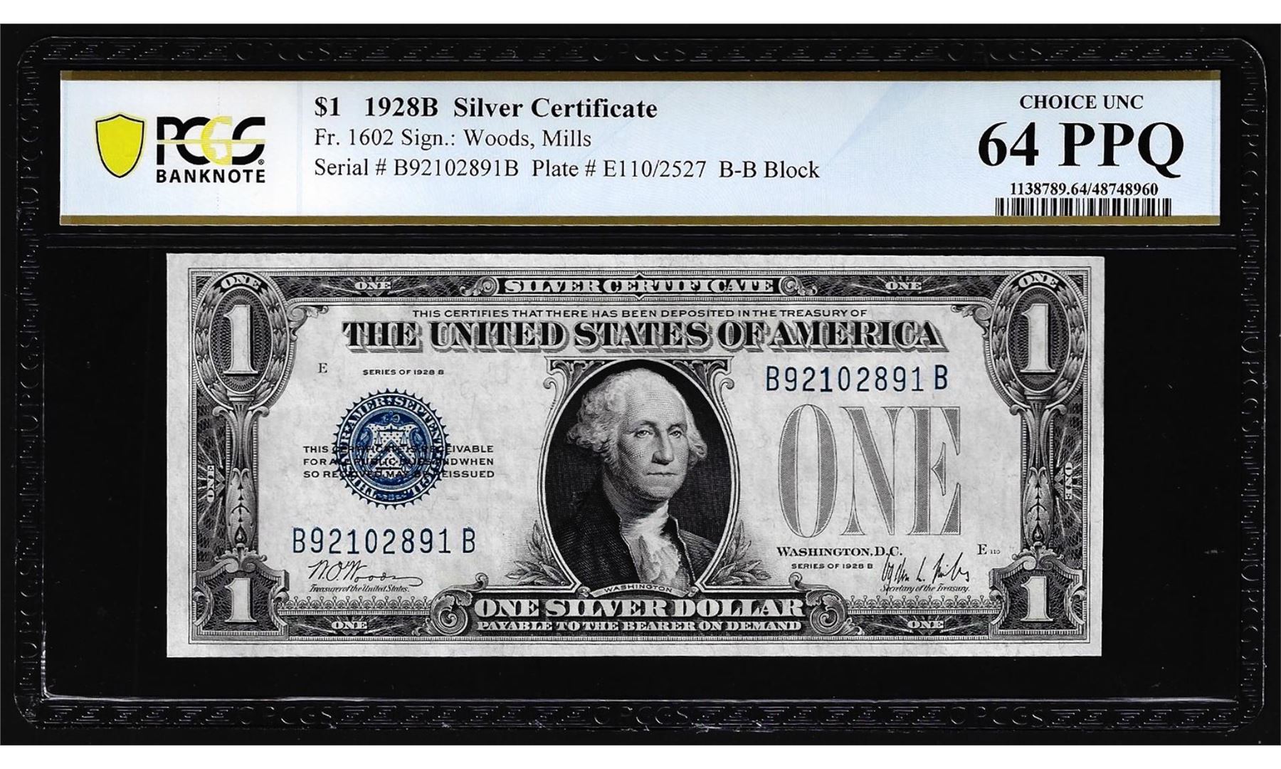 1928B $1 Funnyback Silver Certificate Note Fr.1602 PCGS Choice Uncirculated 64PPQ