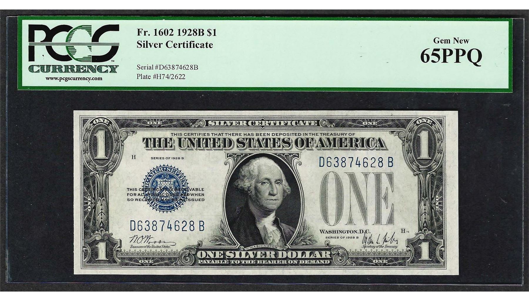 One 1928B $1 Funnyback Silver Certificate Note Fr.1602 PCGS Gem New 65PPQ. PCGS Graded.