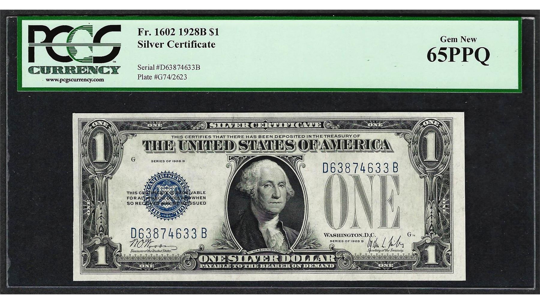 One 1928B $1 Funnyback Silver Certificate Note Fr.1602 PCGS Gem New 65PPQ. PCGS Graded.