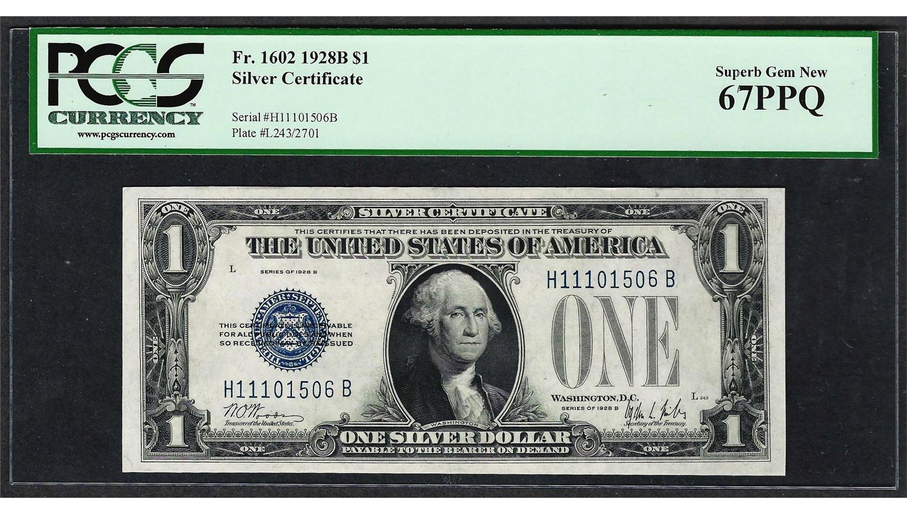 One 1928B $1 Funnyback Silver Certificate Note Fr.1602 PCGS Superb Gem New 67PPQ. PCGS Graded.