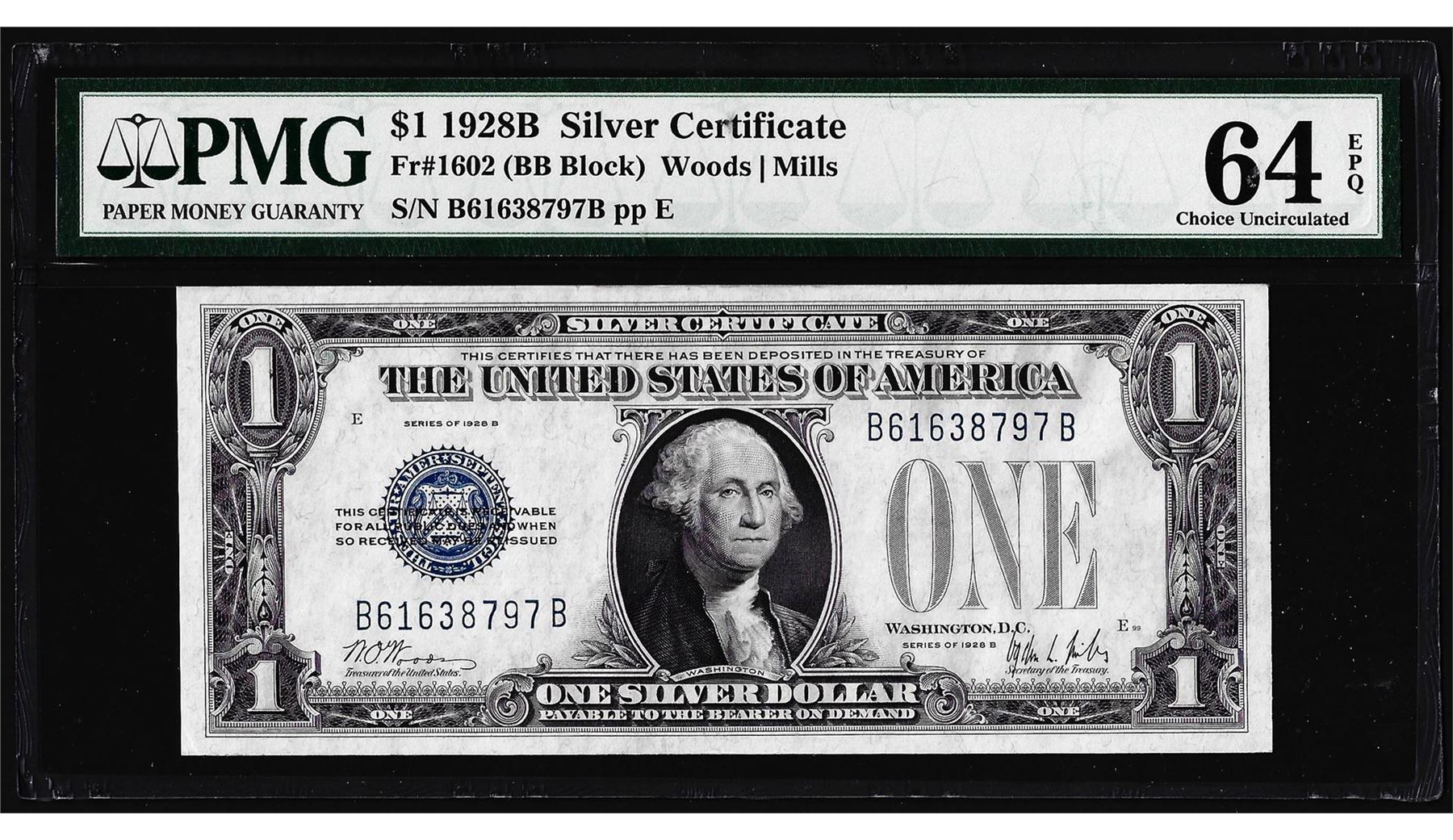 One 1928B $1 Funnyback Silver Certificate Note Fr.1602 PMG Choice Uncirculated 64EPQ. PMG Certified.