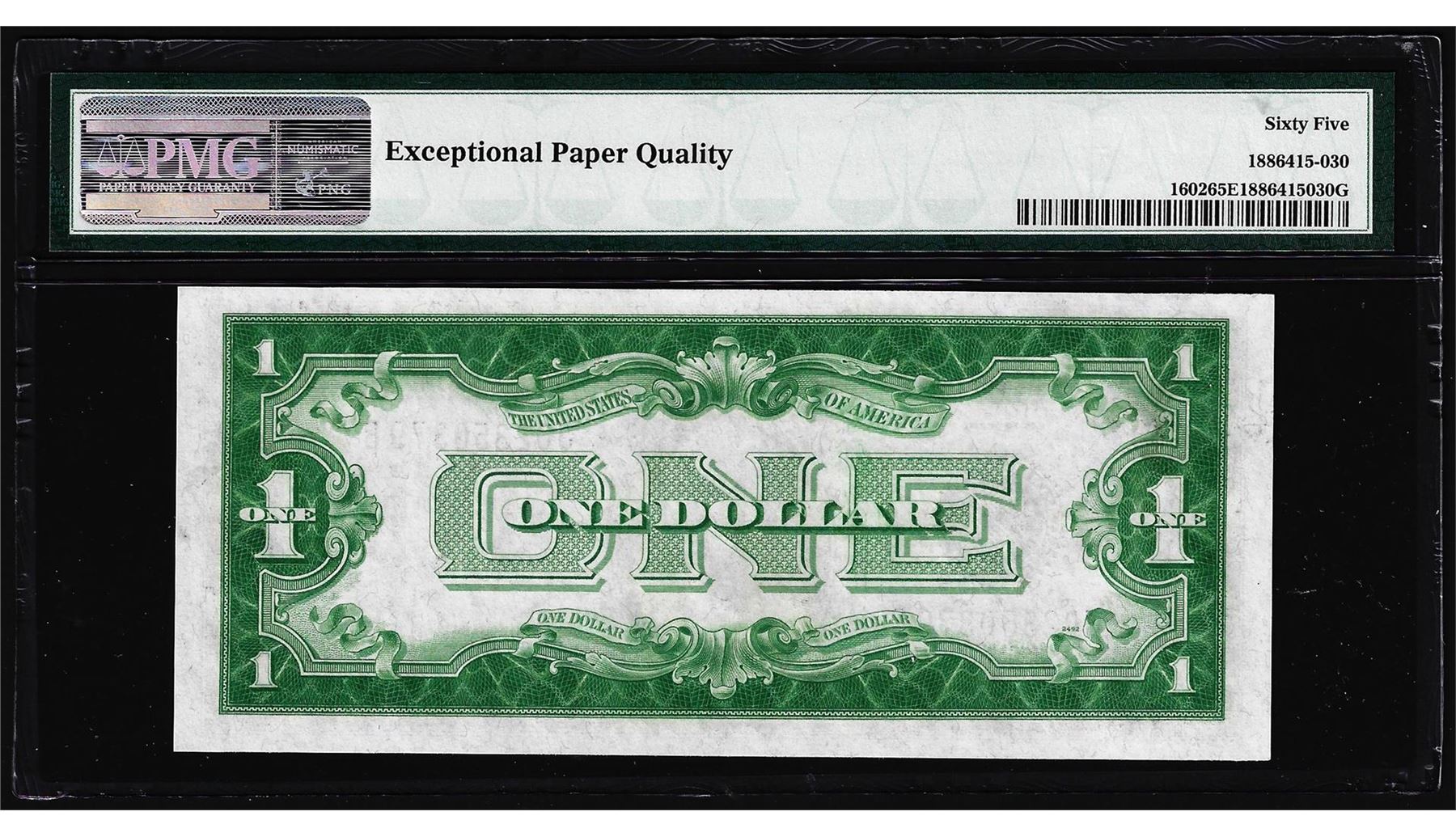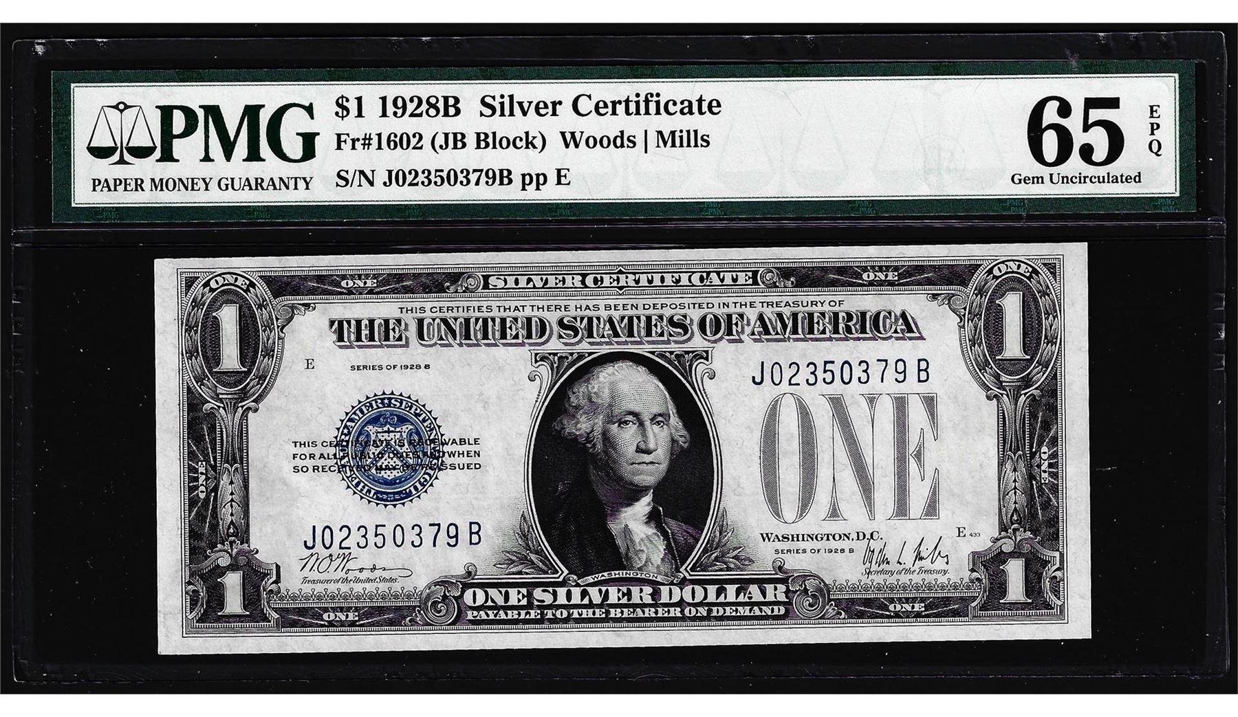 One 1928B $1 Funnyback Silver Certificate Note Fr.1602 PMG Gem Uncirculated 65EPQ. PMG Certified.