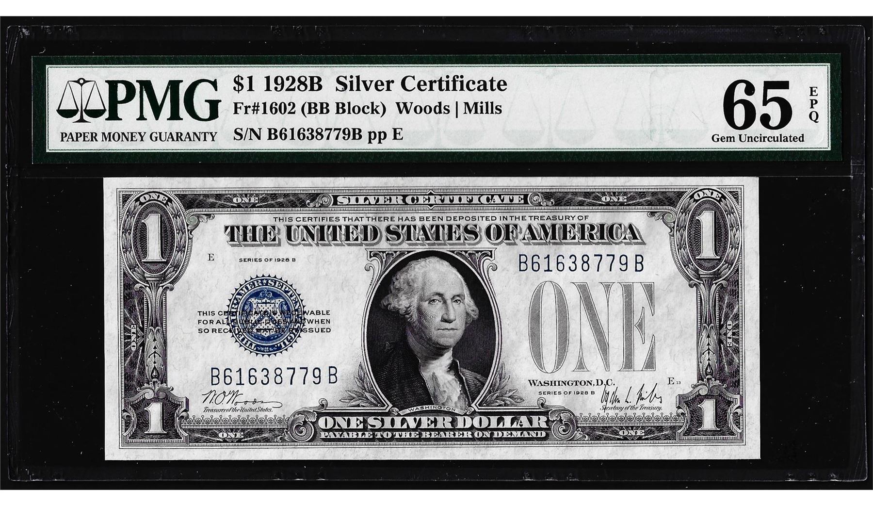 One 1928B $1 Funnyback Silver Certificate Note Fr.1602 PMG Gem Uncirculated 65EPQ. PMG Certified.