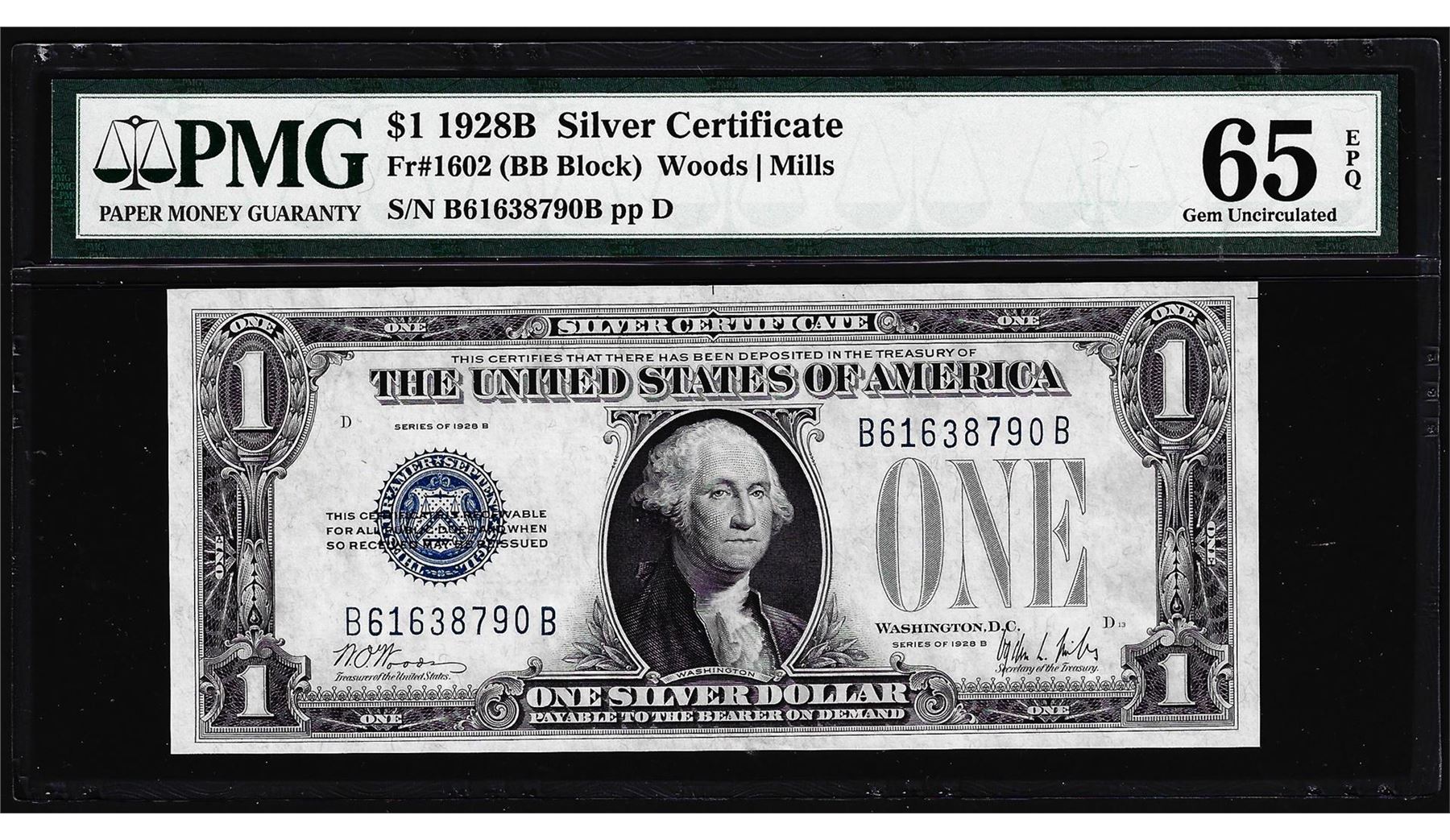 One 1928B $1 Funnyback Silver Certificate Note Fr.1602 PMG Gem Uncirculated 65EPQ. PMG Certified.