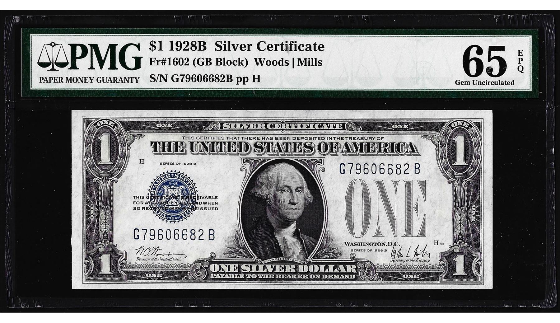 One 1928B $1 Funnyback Silver Certificate Note Fr.1602 PMG Gem Uncirculated 65EPQ. PMG Certified.