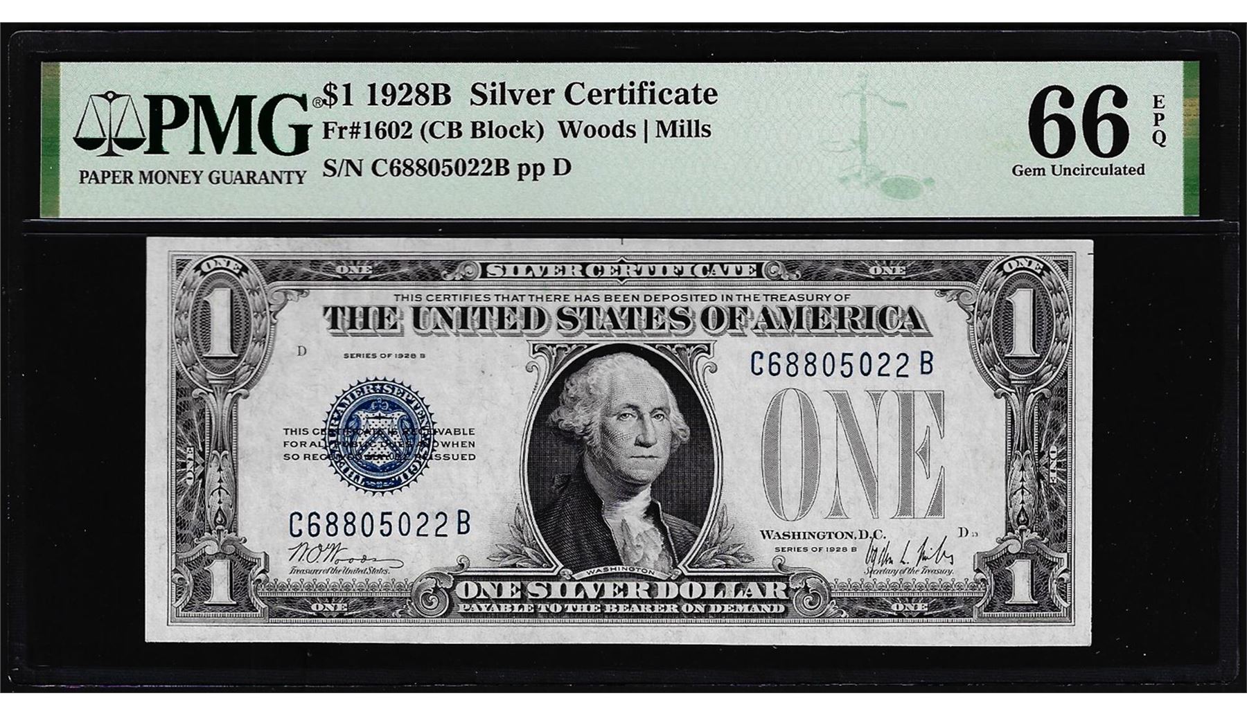One 1928B $1 Funnyback Silver Certificate Note Fr.1602 PMG Gem Uncirculated 66EPQ. PMG Certified.