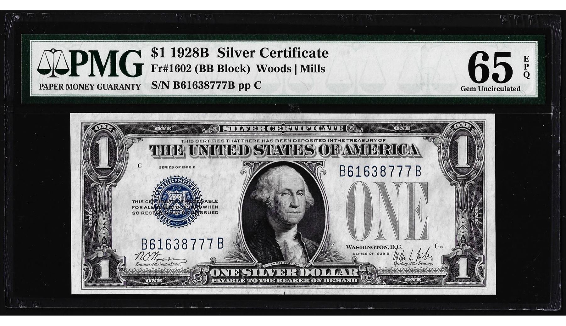 One 1928B $1 Silver Certificate Note Fr.1602 PMG Gem Uncirculated 65EPQ. PMG Certified.