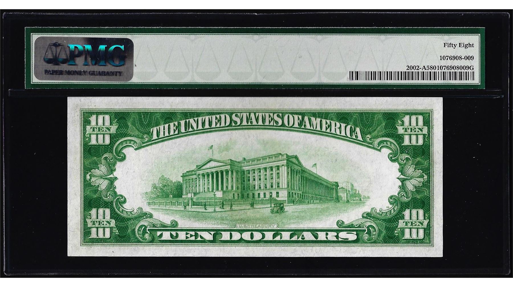 One 1928B $10 Federal Reserve Note Boston Fr.2002-A PMG Choice About Uncirculated 58. PMG Certified.