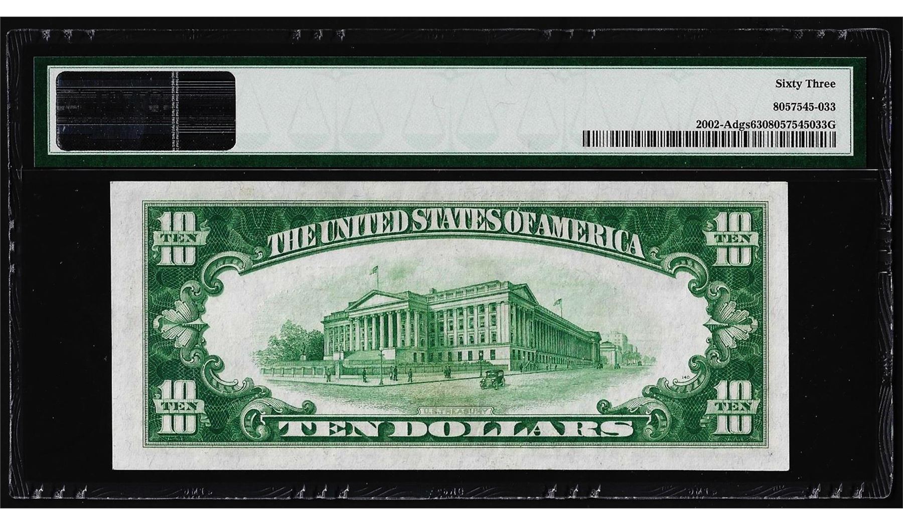1928B $10 Federal Reserve Note Boston Fr.2002-A PMG Choice Uncirculated 63