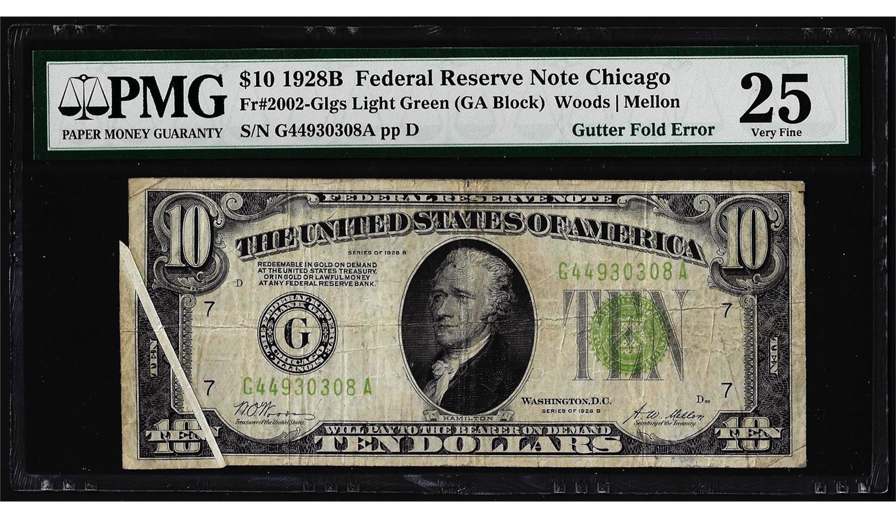 One 1928B $10 Federal Reserve Note Chicago Gutter Fold ERROR PMG Very Fine 25. PMG Certified.