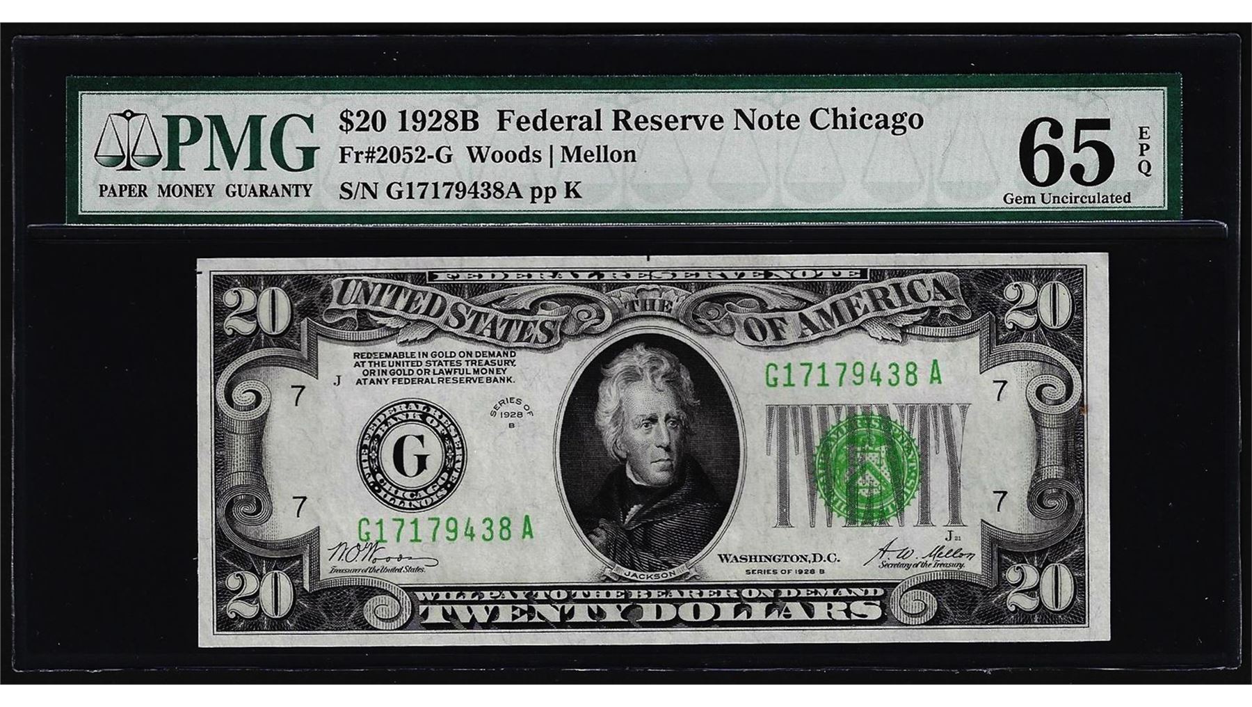 1928B $20 Federal Reserve Note Chicago Fr.2052-G PMG Gem Uncirculated 65EPQ