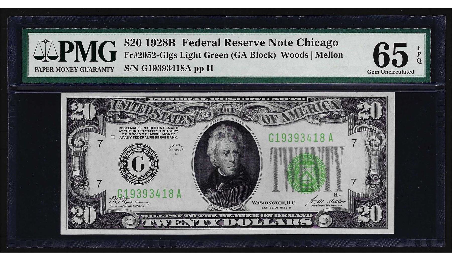 One 1928B $20 Federal Reserve Note Chicago Light Green Seal Gem Uncirculated 65EPQ. PMG Certified.