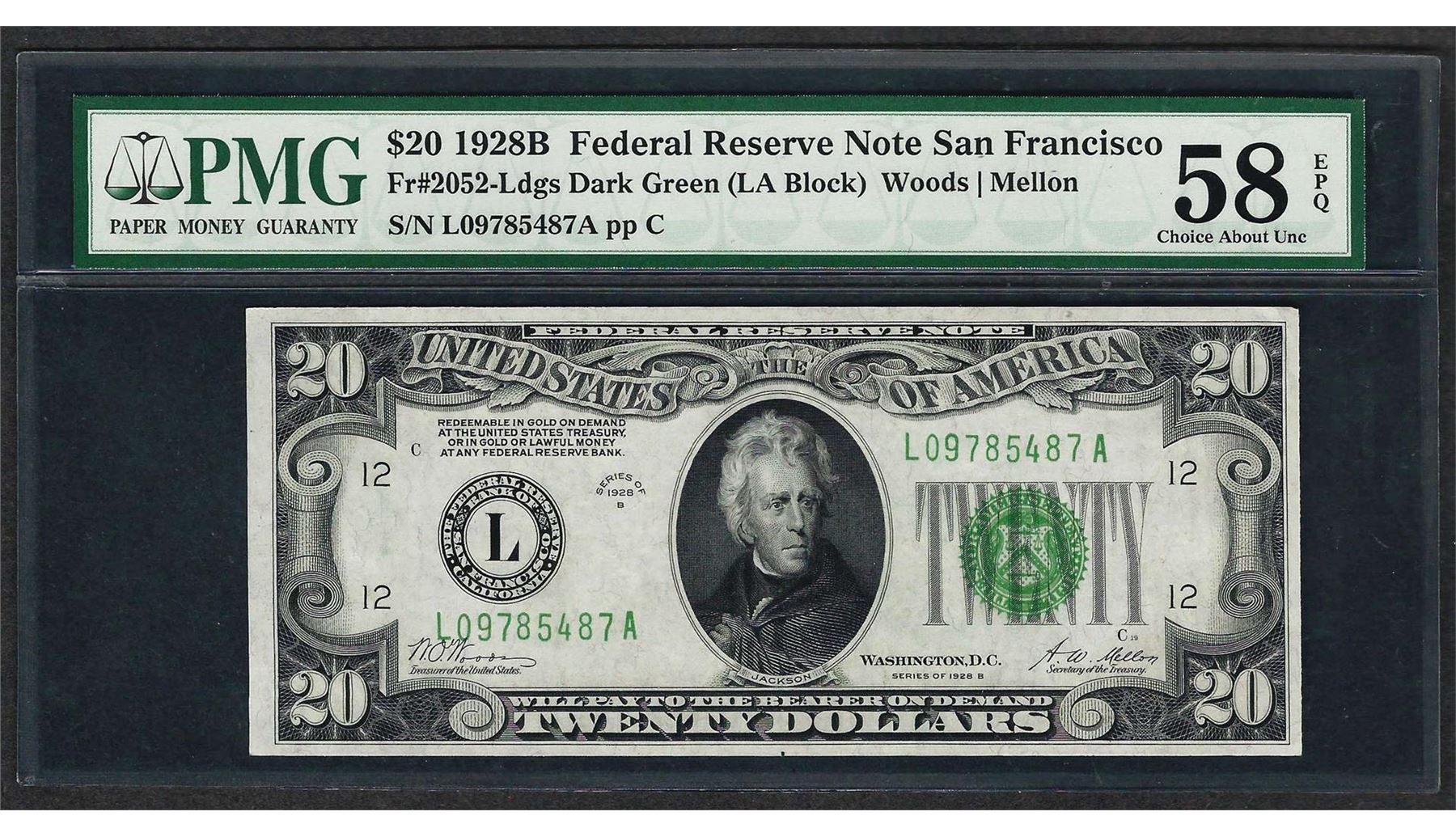 One 1928B $20 Federal Reserve Note Fr.2052-L PMG Choice About Uncirculated 58EPQ. PMG Certified.