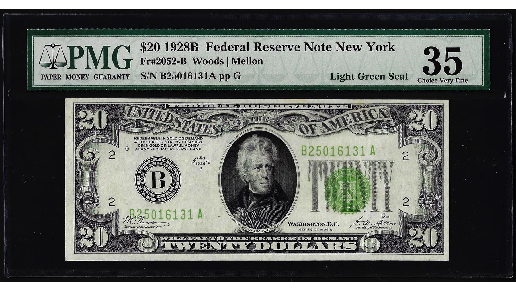 One 1928B $20 Federal Reserve Note New York Fr.2052-B PMG Choice Very Fine 35 LGS. PMG Certified.