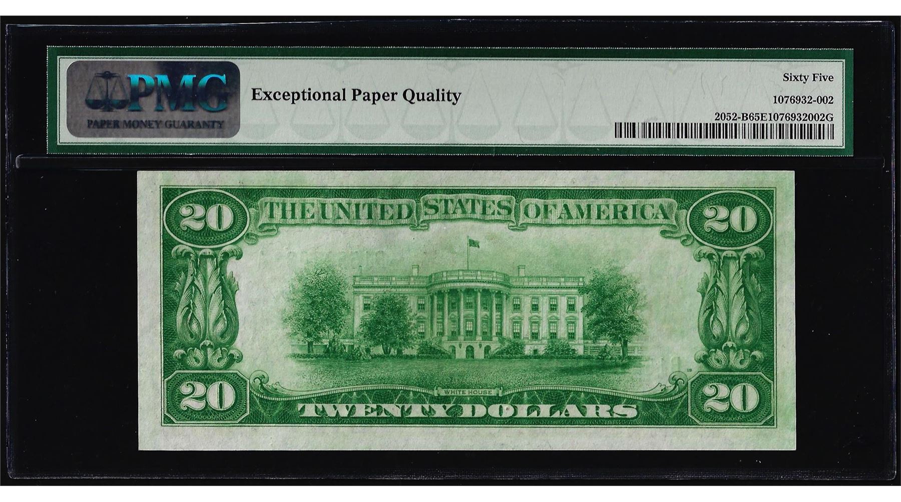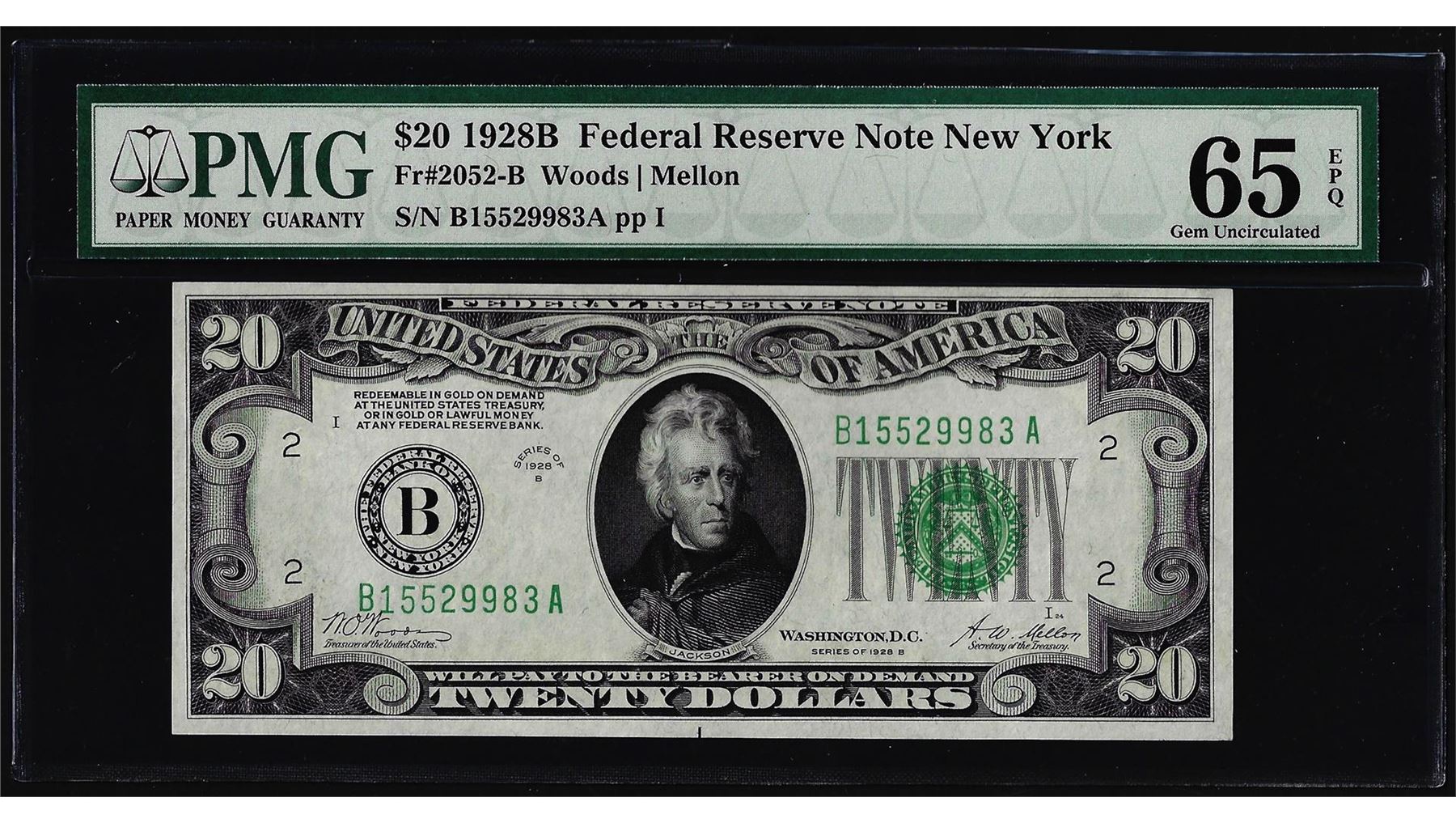 One 1928B $20 Federal Reserve Note New York Fr.2052-B PMG Gem Uncirculated 65EPQ. PMG Certified.