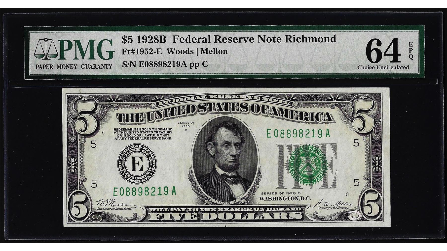 1928B $5 Federal Reserve Note Richmond Fr.1952-E PMG Choice Uncirculated 64EPQ