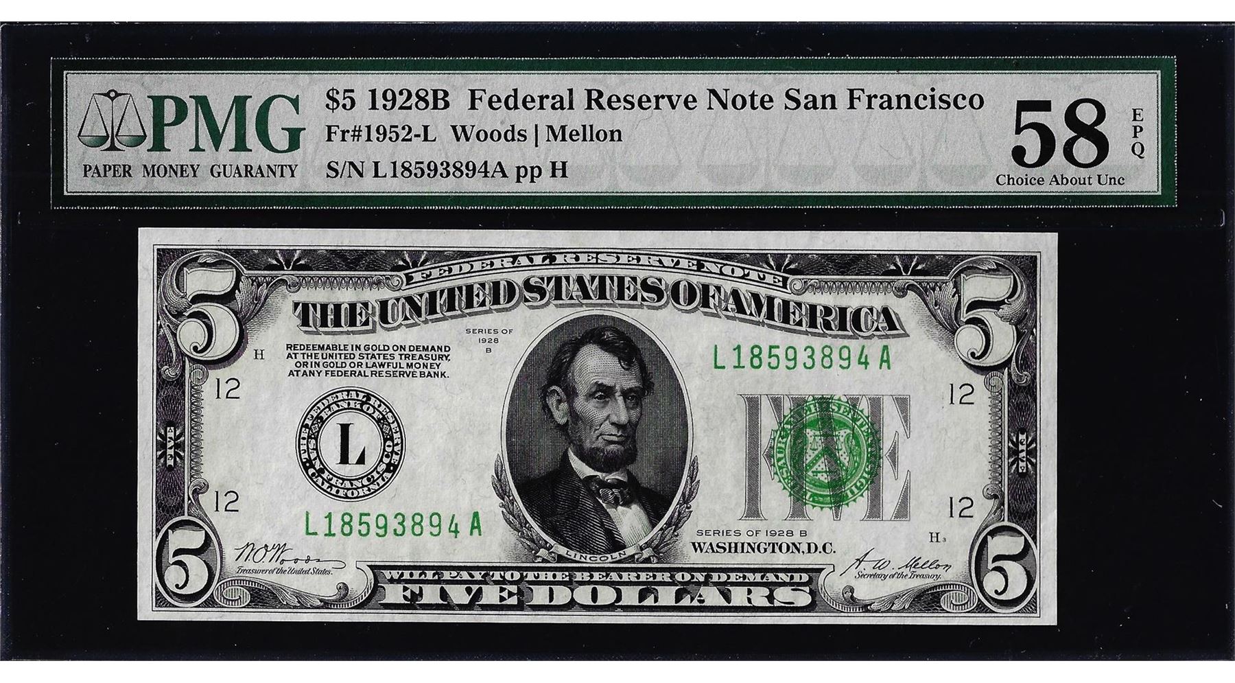 One 1928B $5 Federal Reserve Note San Francisco Fr.1952-L PMG Choice About Unc 58EPQ. PMG Certified.