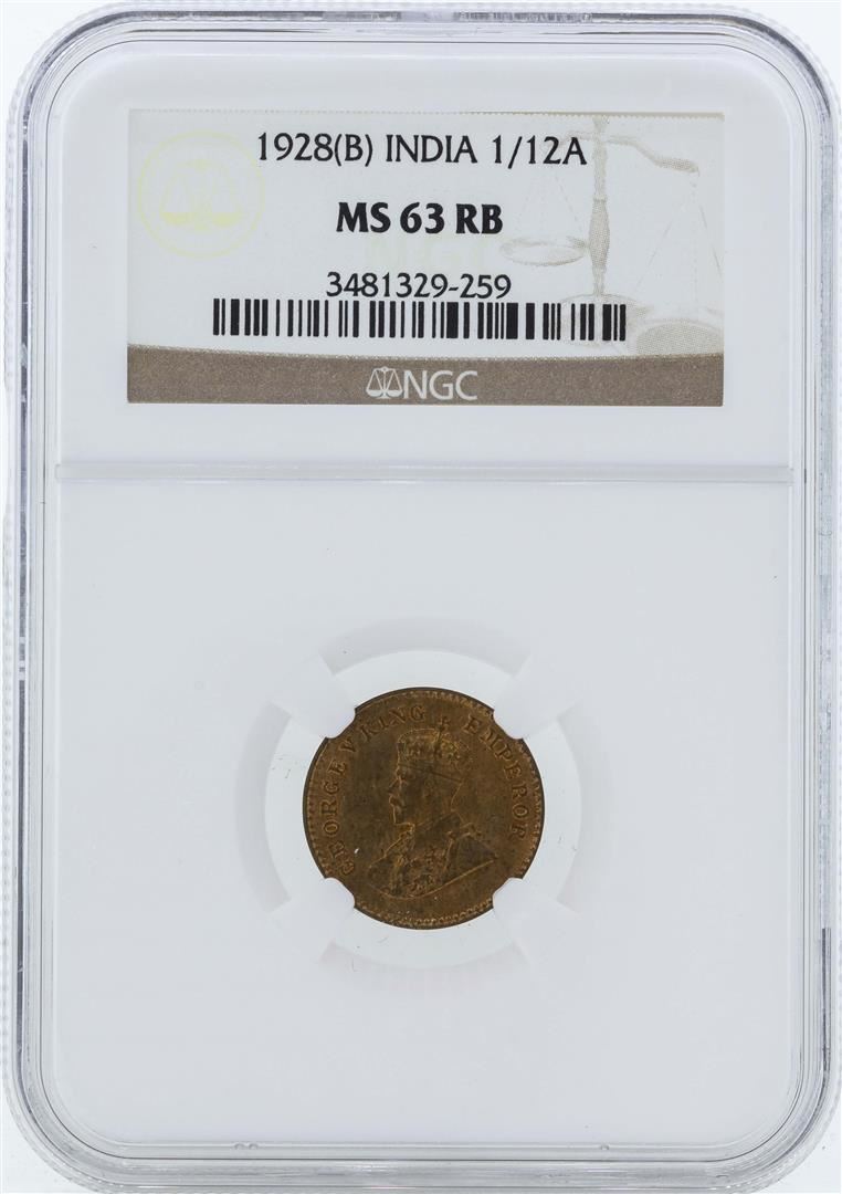 One 1928B India 1/12 Anna Coin NGC MS63RB. NGC Certified.