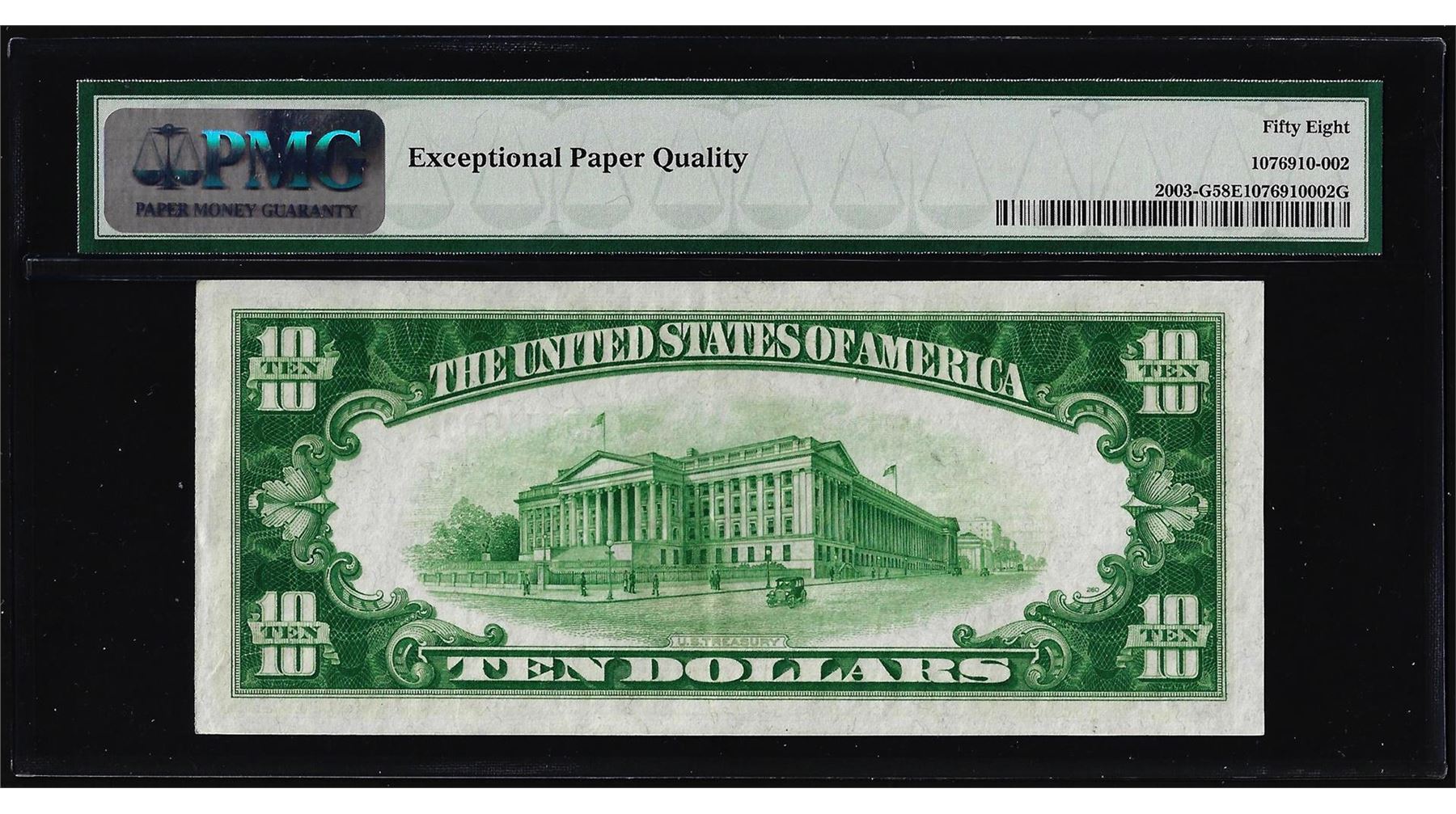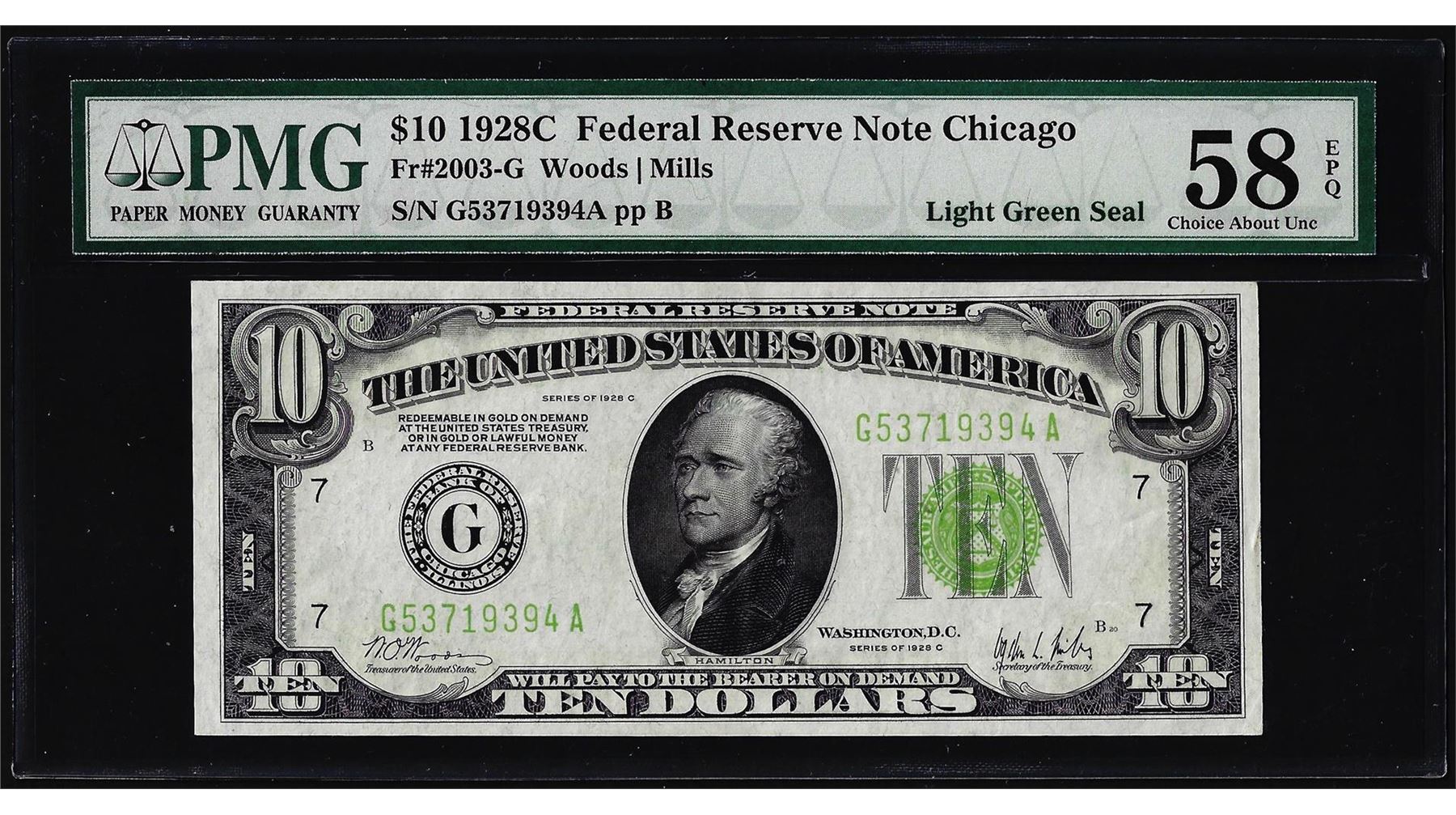 One 1928C $10 Federal Reserve Note Chicago Fr.2003-G PMG Choice About Unc 58EPQ. PMG Certified.