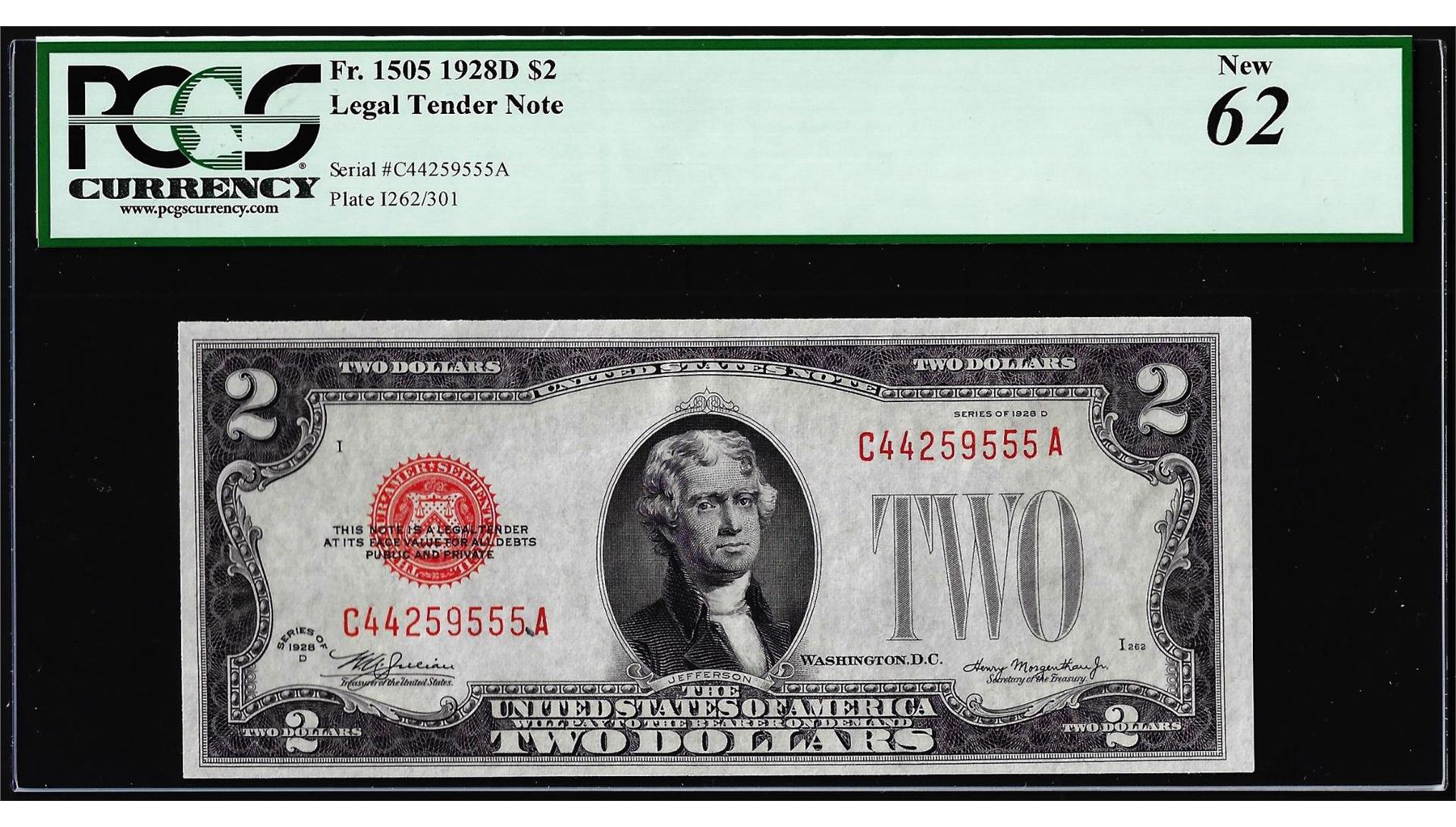 One 1928D $2 Legal Tender Note Fr.1505 PCGS New 62. PCGS Graded.