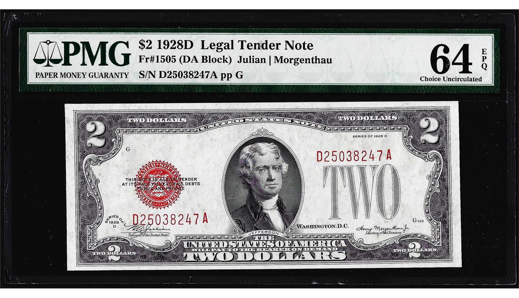 One 1928D $2 Legal Tender Note Fr.1505 PMG Choice Uncirculated 64EPQ. PMG Certified.